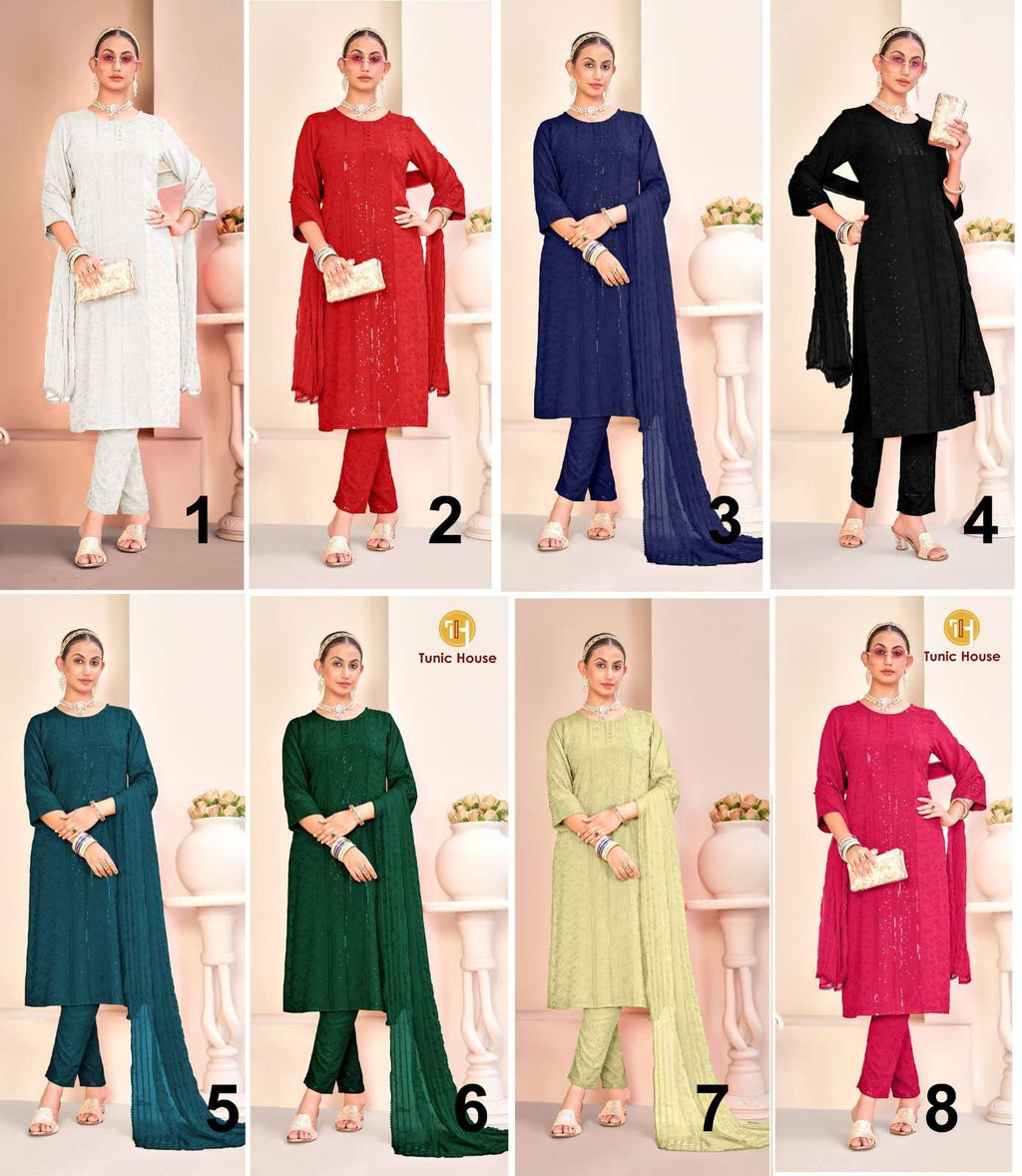 top :- viscouse rayon work details :- fully chikankari sequince work in front+back+sleeves & bottom on daman work