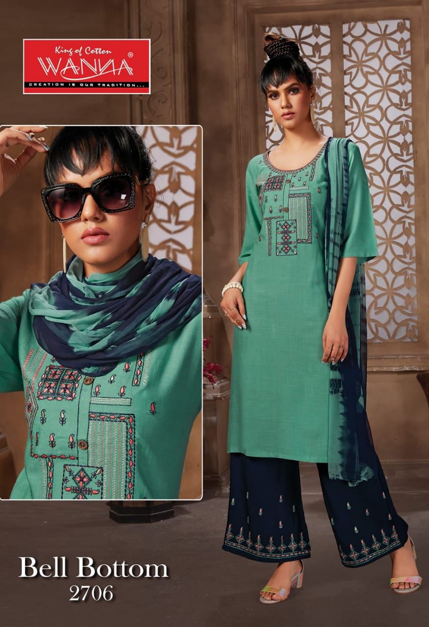 Wanna Launch Bell Bottom Rayon With Embroidery Work Designer Long Straight Fancy Kurtis
