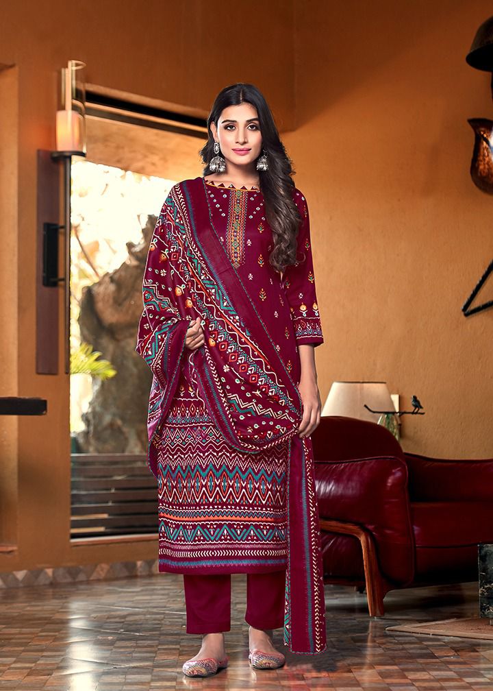 TOP :- *Pasmina jaquard * BOT:- *Heavy pashmina spun bottom * *Dupatta:- TWILL PASHMINA SHAWL *PRINTED 2:25 cut * |