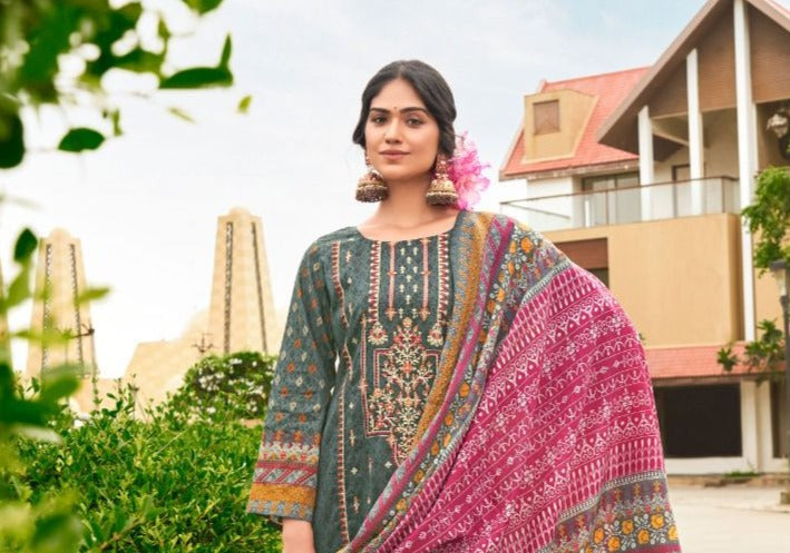 Top : Embroidered beautiful self work Lawn (cut:2.40mtr) Bottom : semi lawn (cut:2.40mtr) Dupatta: Semi Cotton Mal Mal (cut 2.25 mtr) |