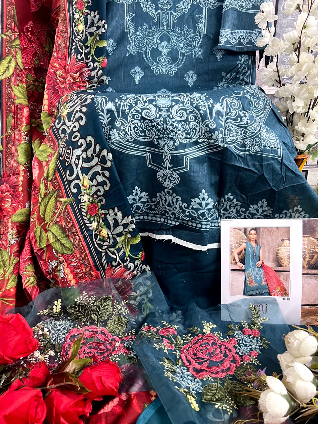 Other Details | Top: Pure Cotton Print With Heavy Embroidery (Three Patches) Bottam: Semi Lawn Dupatta: Silver Chiffon / Cotton Mal Rate: 575/-(Cotton) 525/-(Chiffon) |