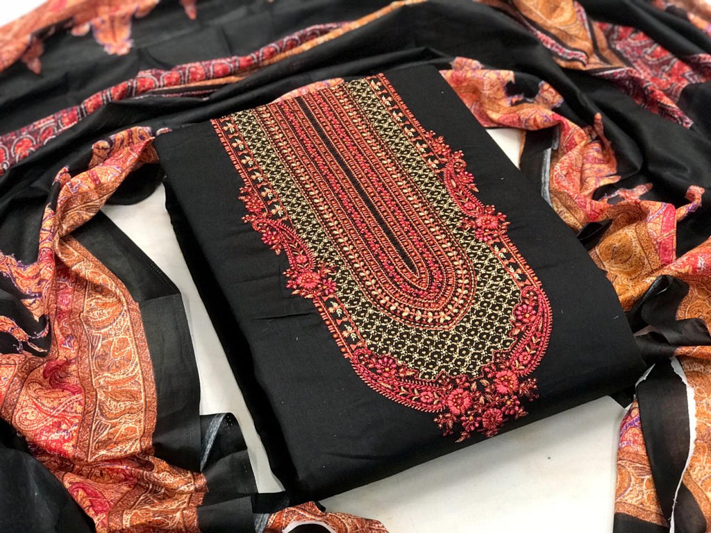 Fabric Details – Top – Pure Jam Satin Digital Print Kashmiri Embroidery On Neck Bottom – Pure Lawn Dyed (2.80 Mtr App) Dupatta – Pure Lawn Digital Print Box Pallu Digital Print (2.50 Mtr App) |