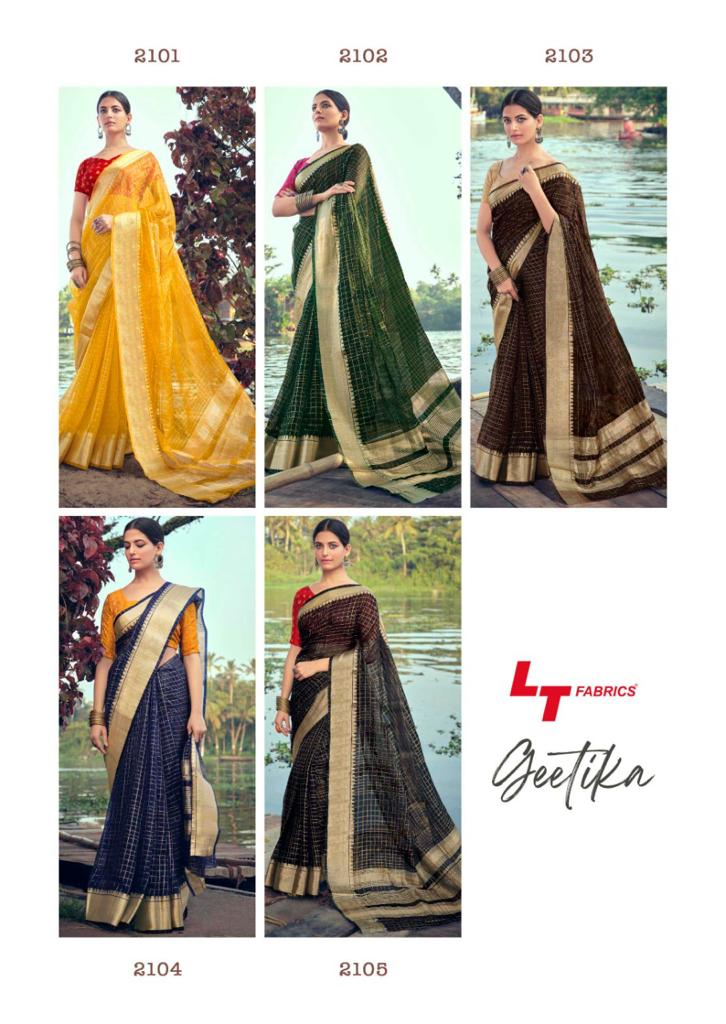 L.T FABRICS PVT.LTD GEETIKA FABRIC – KORA SILK WITH WEAVING ZARI AND FANCY CONTRAST BLOUSE RATE:- 1550/- SET – 10 pc |