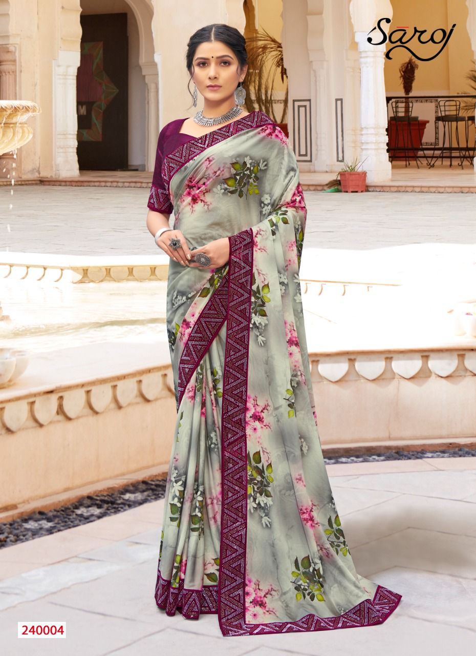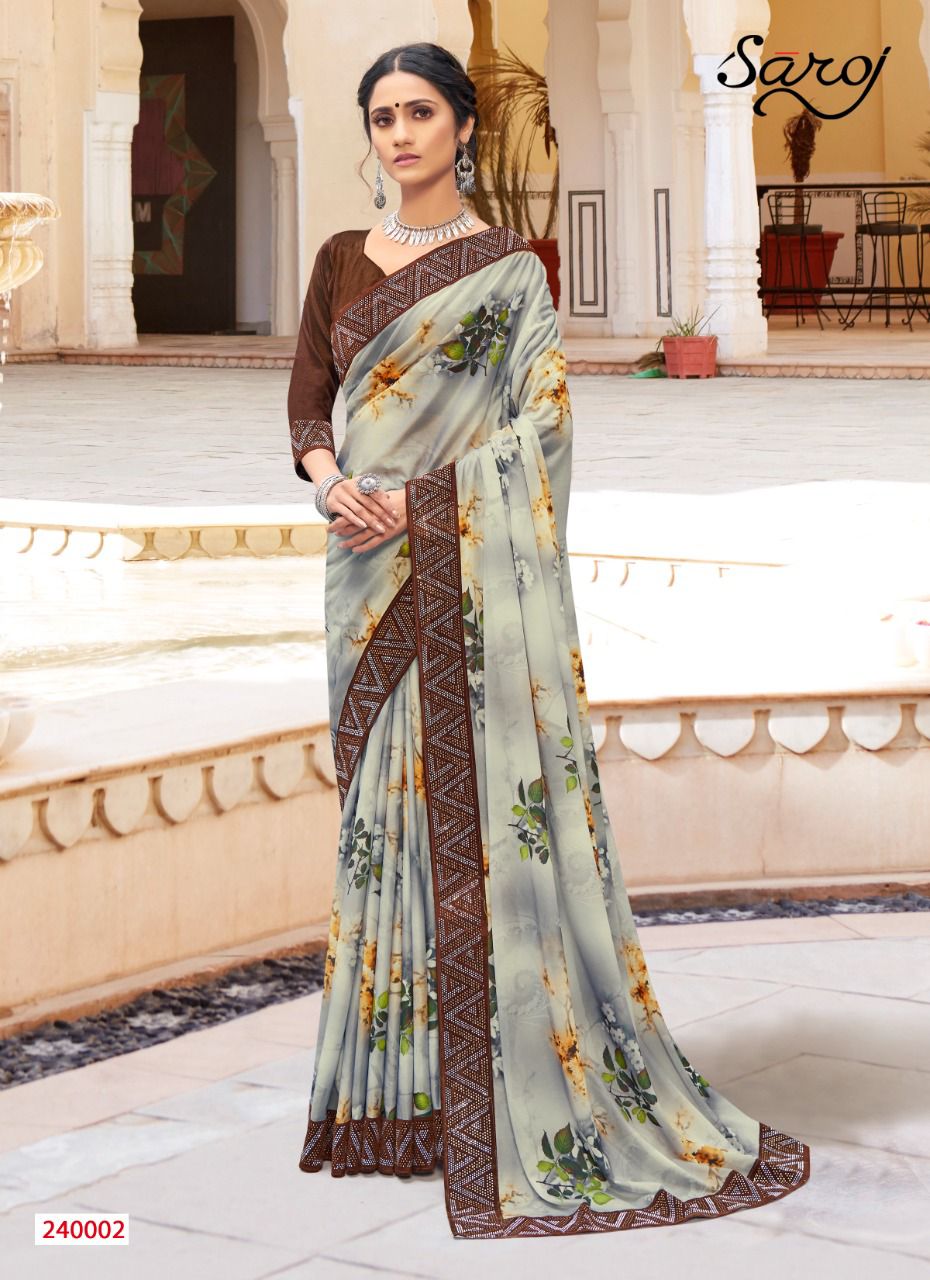 Fabric details: Fabric: Lycra With Digital Print & Velvet Border With Heavy Swarovski. |