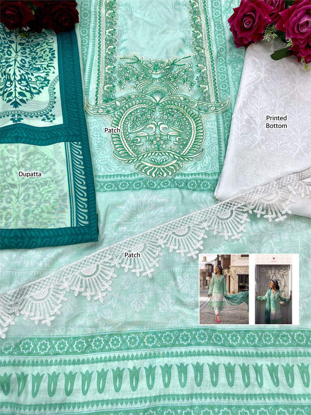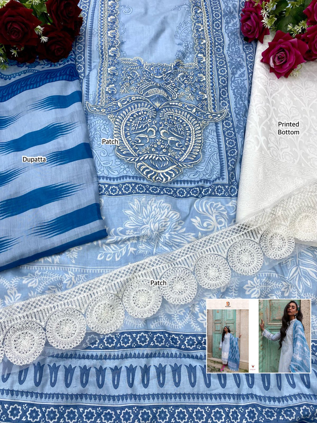 Fabric Details : Top: Lawn Cotton Printed With Heavy Embroidery Patches Bottom- Semi Lawn /2 Design Printed Dupatta :Chiffon Printed / Mal Mal Cotton Printed |