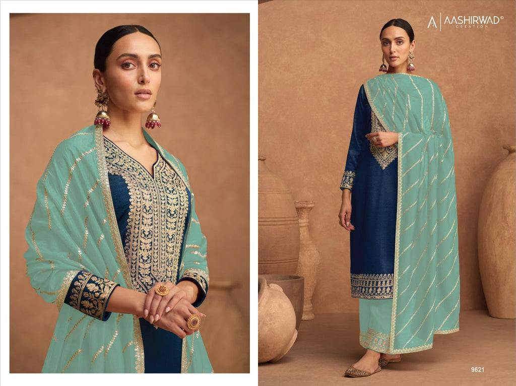Aashirwad Creaton Kesariya Colors Silk Heavy Embroidery Work Fancy Partywear Salwar Kameez