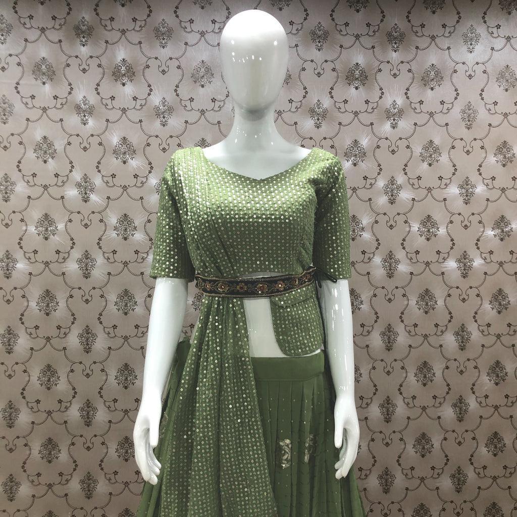 Lehenga Fabric :- Fox Georgette + Can Can Net (14”) Lehenga Inner :- Santoon + Net +Cavans Belt Lehenga Work :- Heavy Embroidery Sequence + Thread Work Lehenga Colour :- Mahendi Green Lehenga Length :- 44″ Lehenga Size :- 42″ Lehenga Flair :- 3 mtr Blouse Fabric :- Fox Georgette (1 Mtr) + West Belt + pocket (Embroidery Work ) Blouse Inner :- Santoon Blouse Colour :- Mahendi Green Blouse Work :- Heavy Embroidery Sequence + Thread Work Dupatta Fabric :- Fox Georgette (2.25 MTR) Dupatta Colour :- Mahendi Green Dupatta Work :- Heavy Embroidery Sequence + Thread Work |
