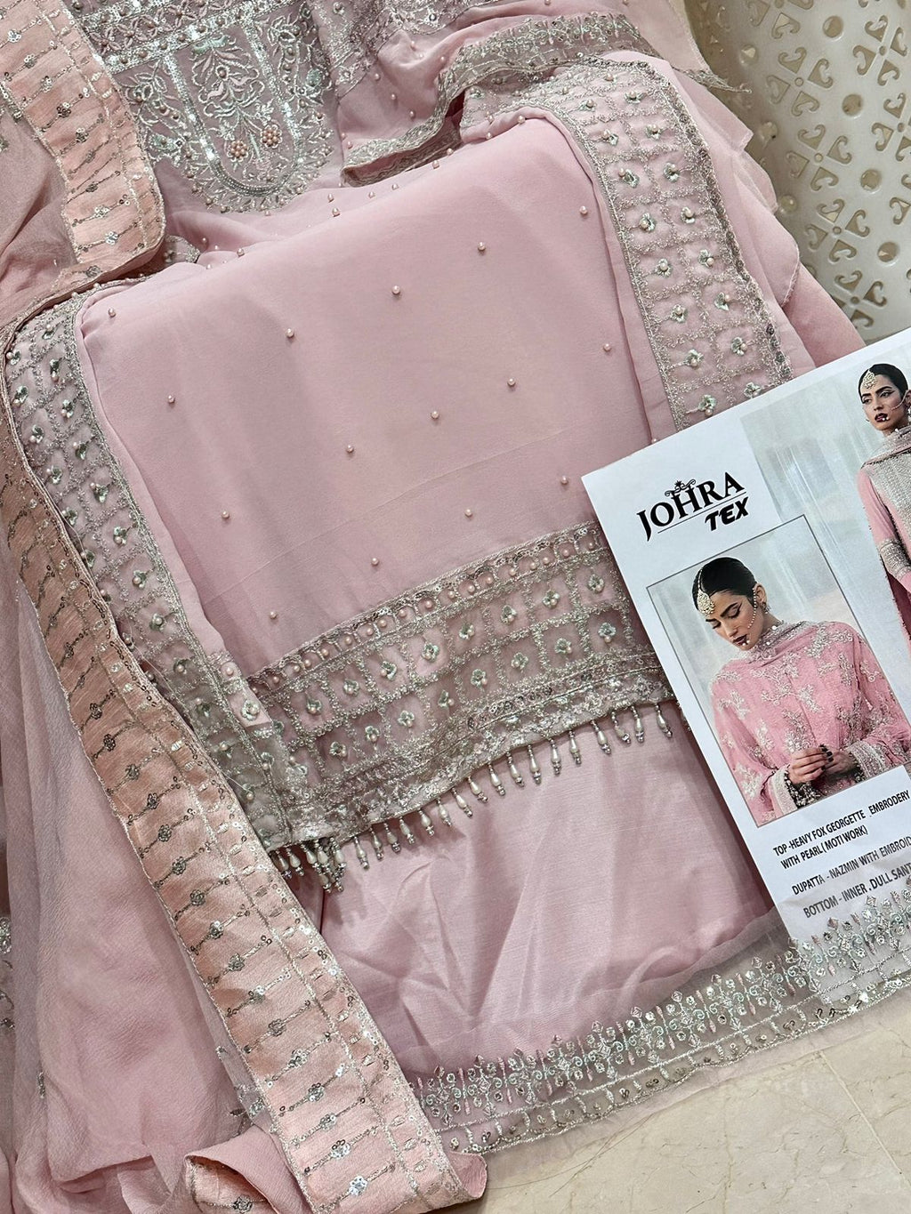 Top :- HEAVY FOX GEORGETTE EMBROIDERED WITH PEARL (MOTI WORK)
