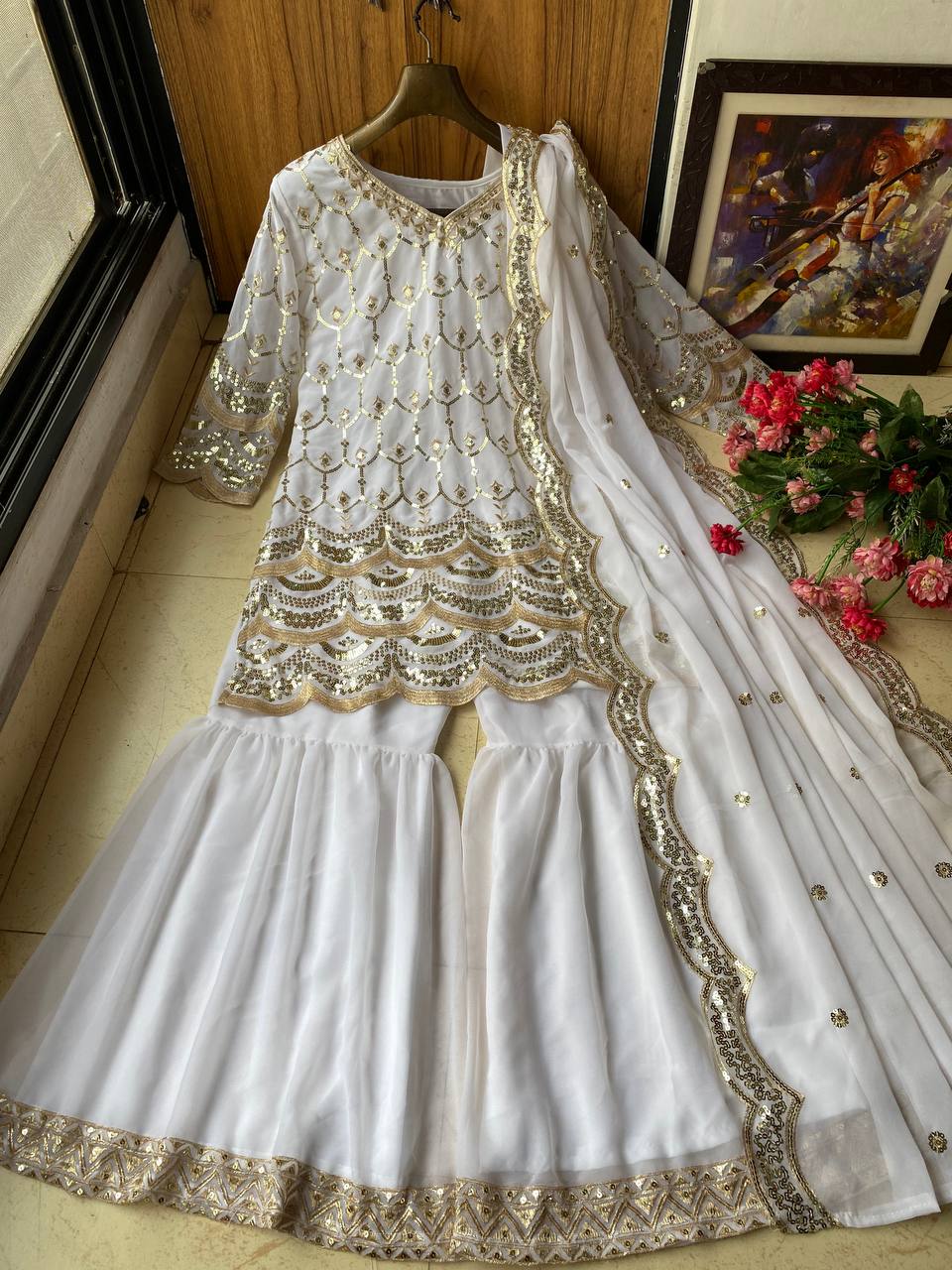 TOP : HEAVY GEORGETTE WITH. SEQUENCE EMBROIDERY(FULLY STITCHED) WORK : SEQUENCE EMBROIDERY |