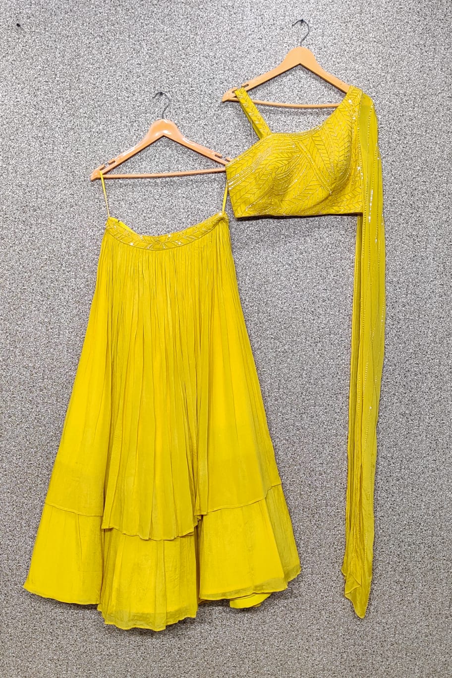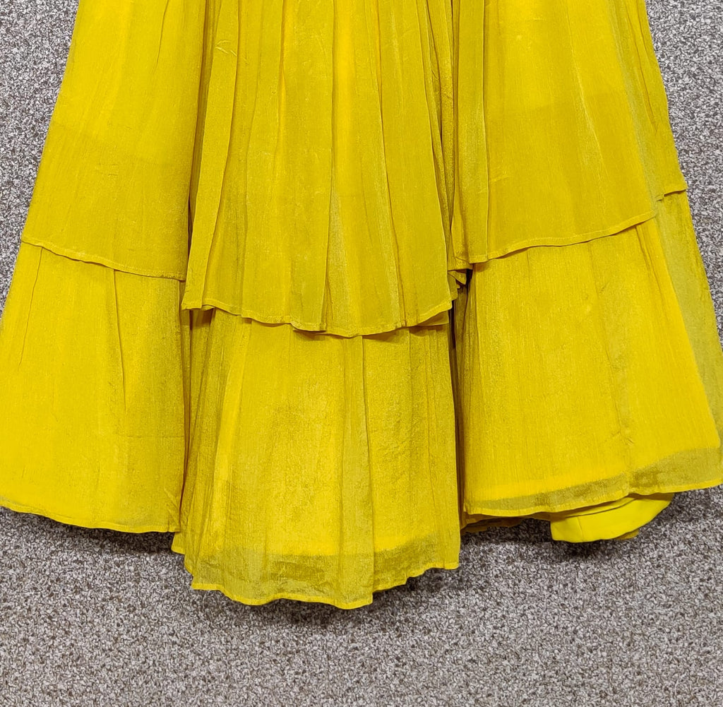 Skirt : Pure chinnon. Choli : Pure chinnon with Fancy handwork. Dupatta : Pure chinnon with Fancy style. |