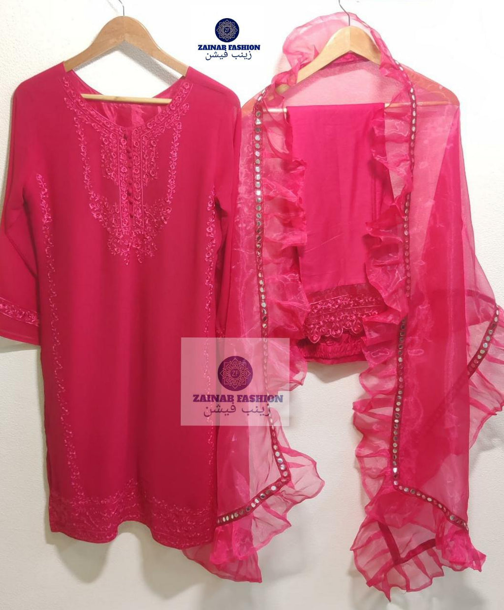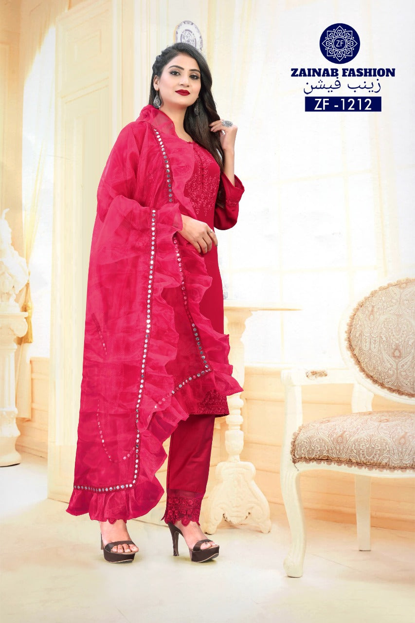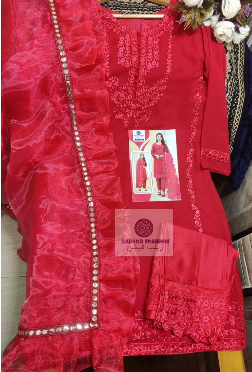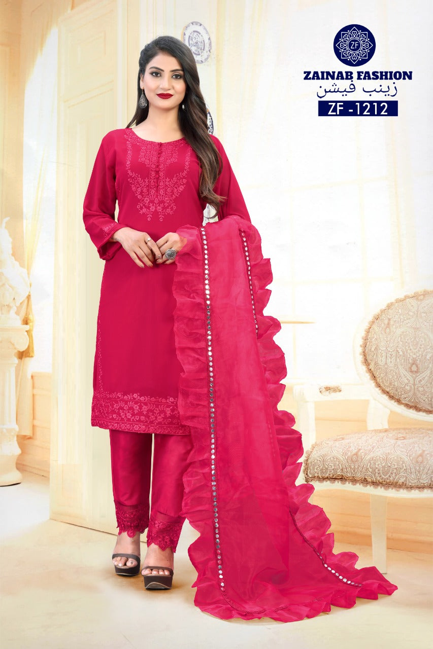 Other Details | Top :- Fox gorget top wth Embroidery Inner santoon Bottom :- pure jam cotton pant wth heavy patch Dupatt :- orgenza with designer 4 side miror lace with frill Colour- Hot pink Size Chart Top xl size chest (42) Bottom xl size (36-42) Rate:- 1199 |