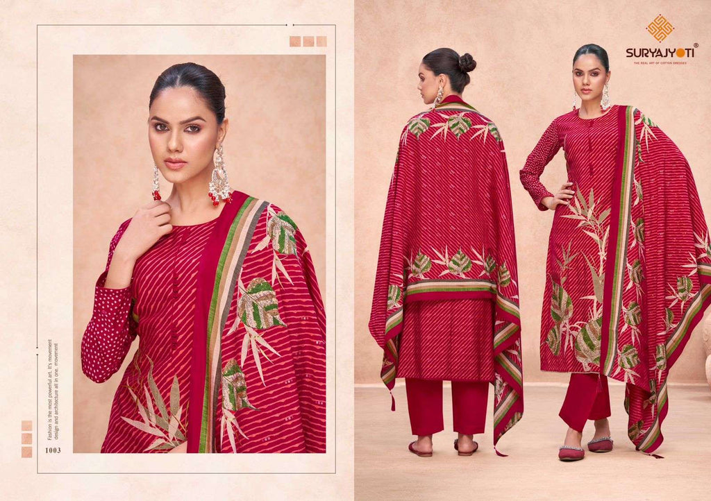 top:- pure modal discharge print with foil n hand work bottom:- pure modal dyed dupatta:- pure modal discharge print with tessels cut:- 2.50-2.50-2.25 |
