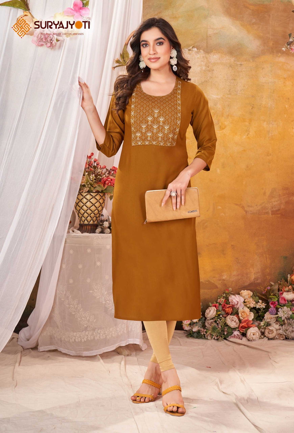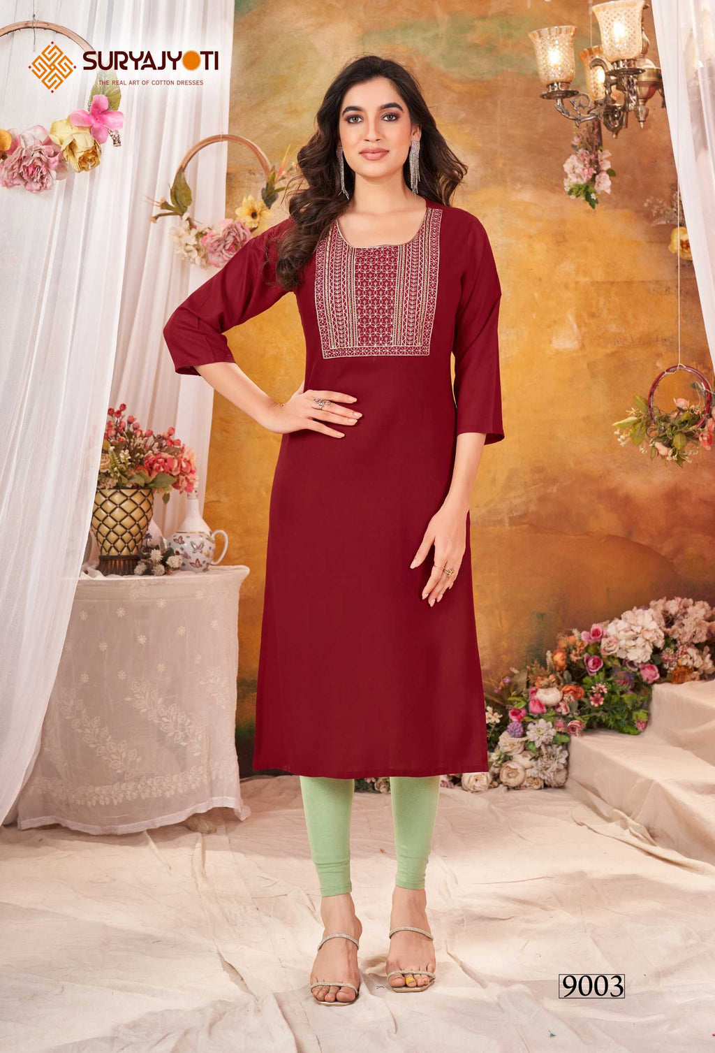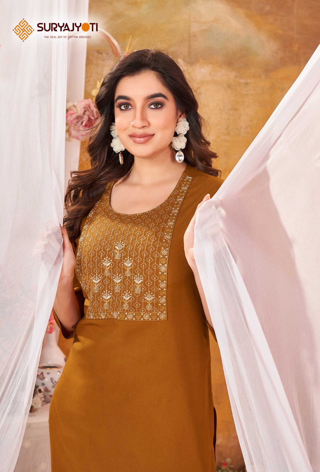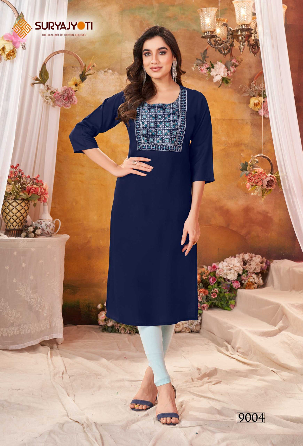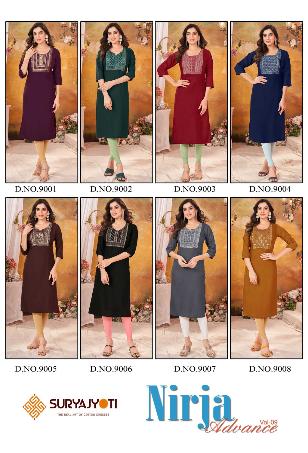 PRODUCT OF SURYAJYOTI CATALOGUE:- NIRJA ADVANCE VOL-9 CLOTH:- RAYON WITH NECK EMBROIDERY |