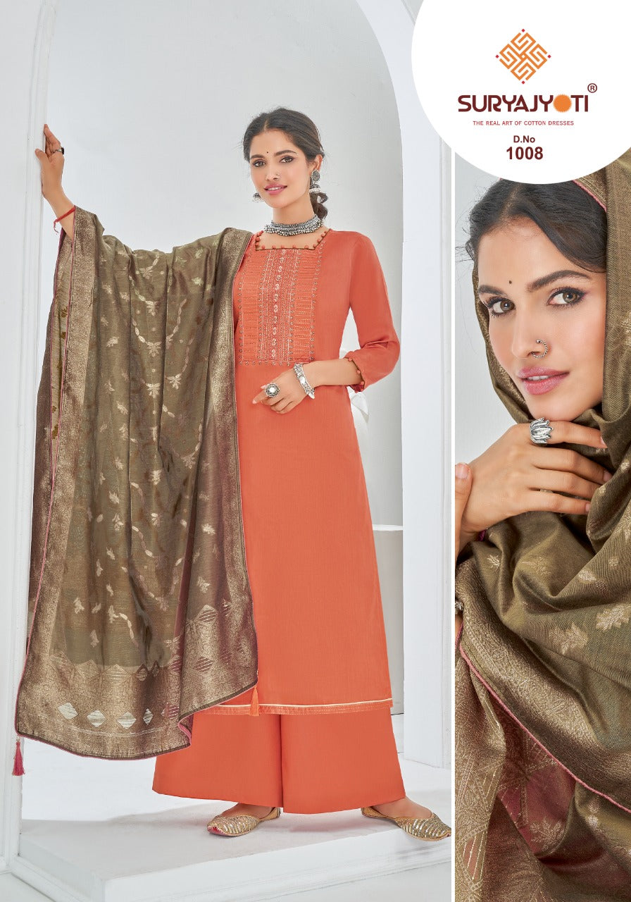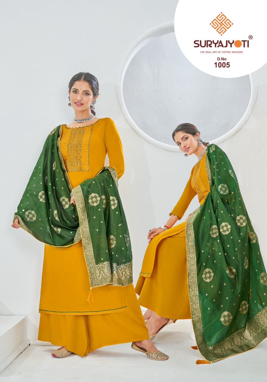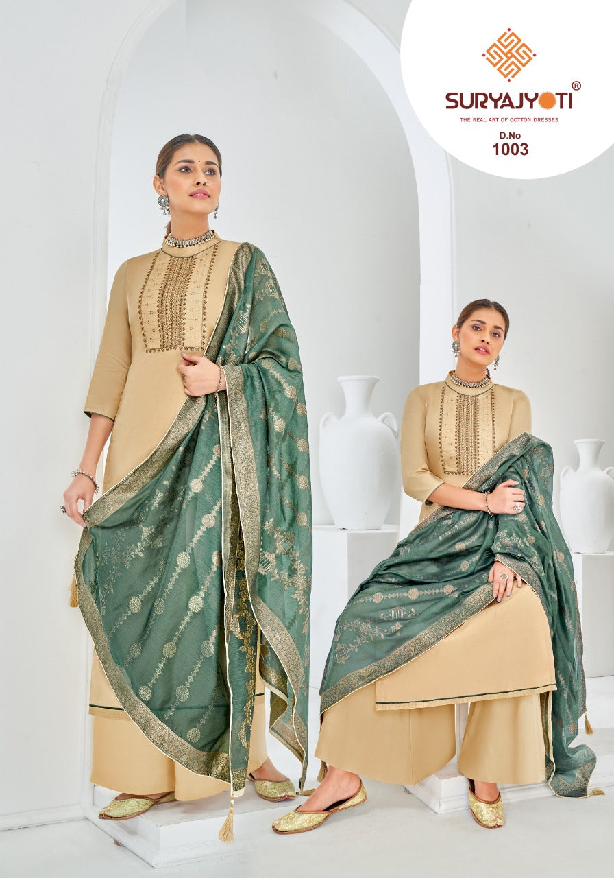 Fabric Details : Top :- Jam Satin With Neck Embroidery & Swarovski Diamond Work Dupatta :- Fancy Jacquard Dupatta With Four Side Piping Lace & Tassels Bottom :- Cotton Solid |
