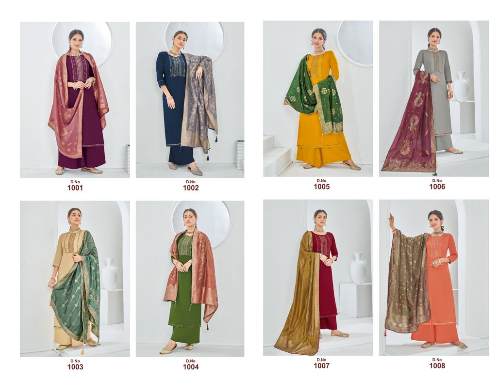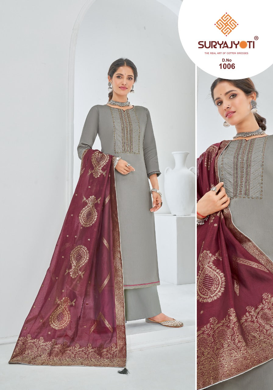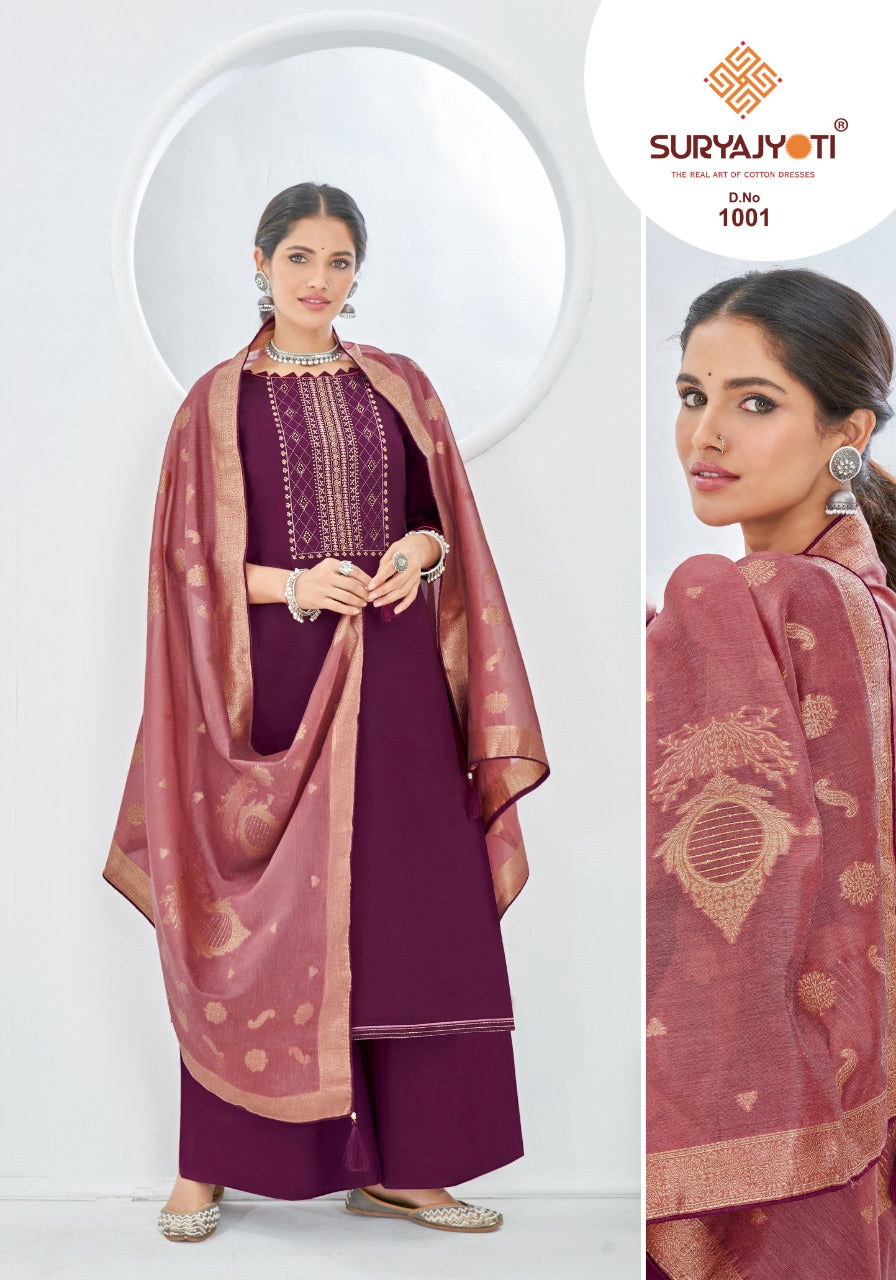 Fabric Details : Top :- Jam Satin With Neck Embroidery & Swarovski Diamond Work Dupatta :- Fancy Jacquard Dupatta With Four Side Piping Lace & Tassels Bottom :- Cotton Solid |