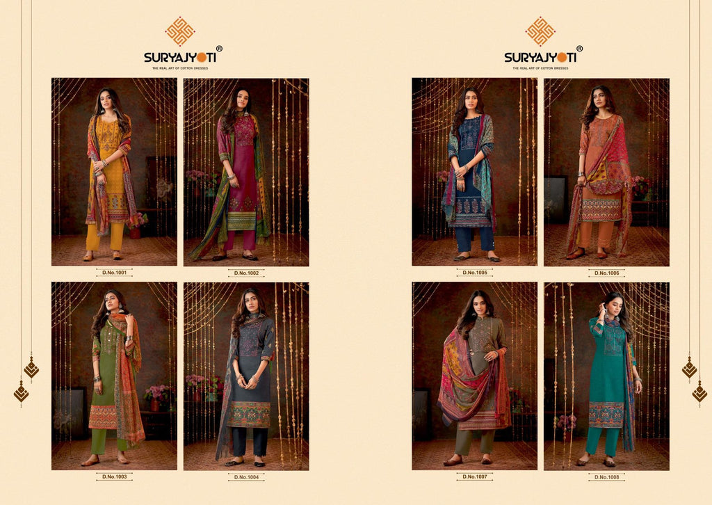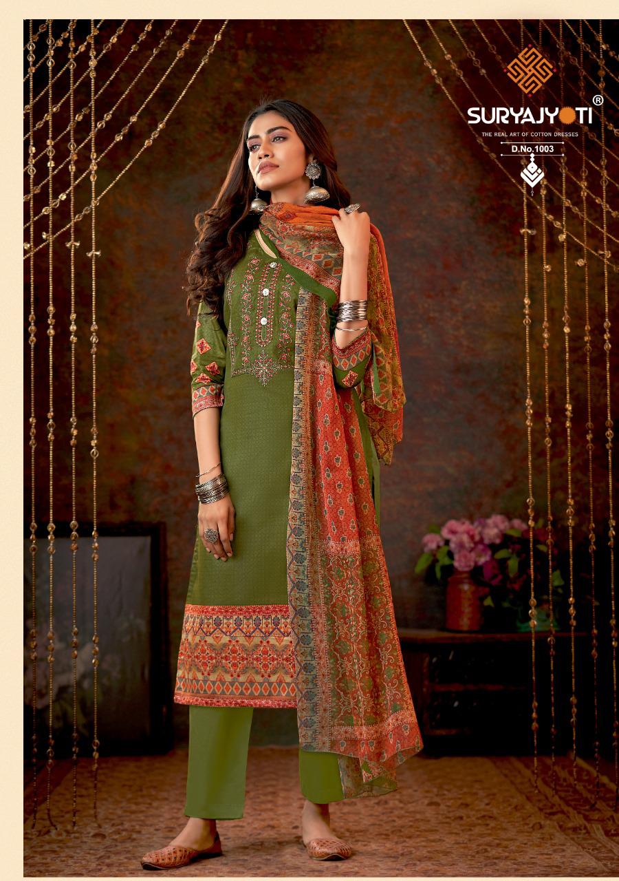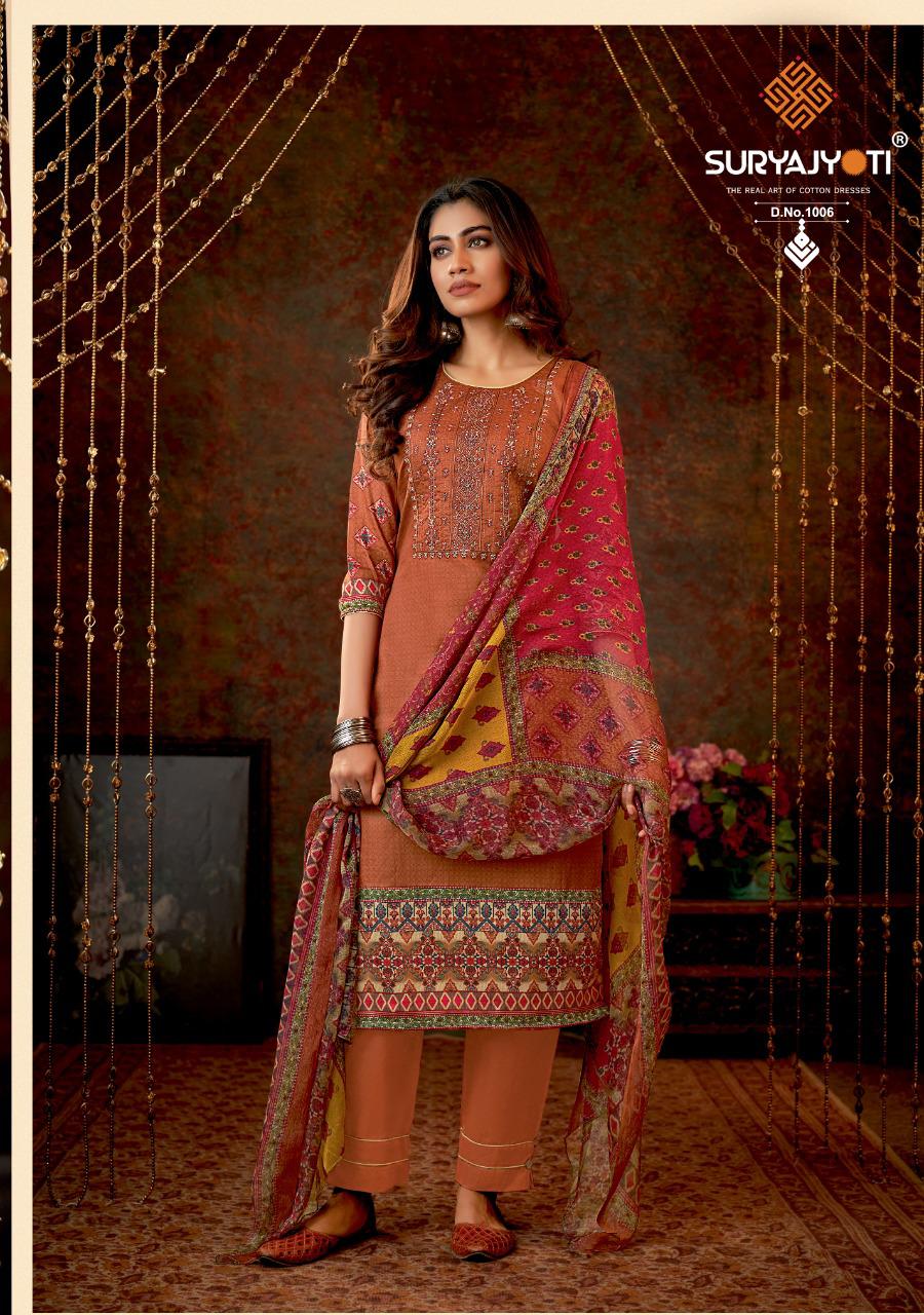 Fabric Details : Cloth :- Jam Satin Print With Neck Embroidery Work Dupatta :- Pure Bemberg Print Bottom:- Pure Cotton Cut:- 2.5-2.5-2.25 |