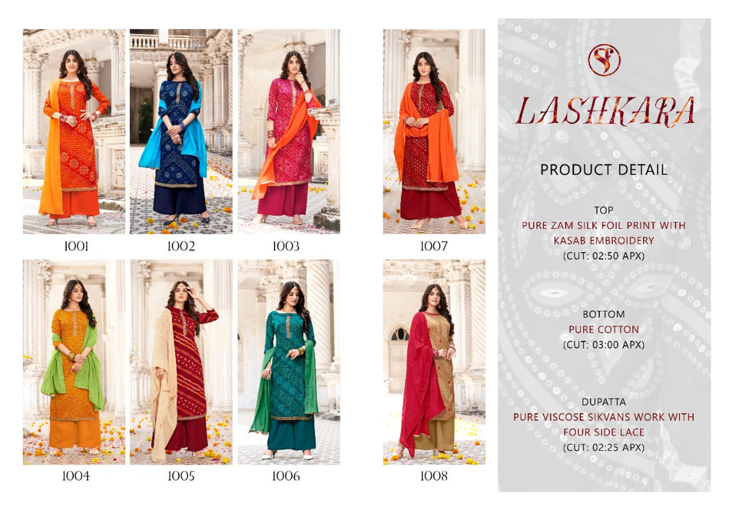 Top :2.50 mtr (PURE ZAM SILK FOIL PRINT WITH KASAB EMBROIDERY) Bottom : 3.00 mtr (PURE COTTON ) Dupp: 2.25mtr (PURE VISCOSE SIKVANS WITH FOUR WITH LACE ) |