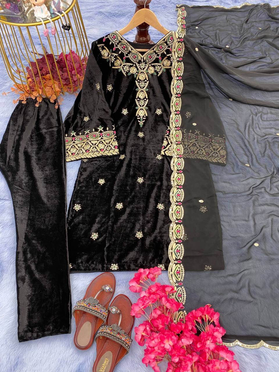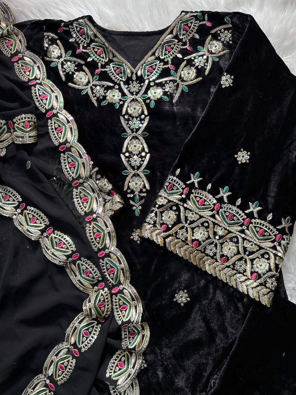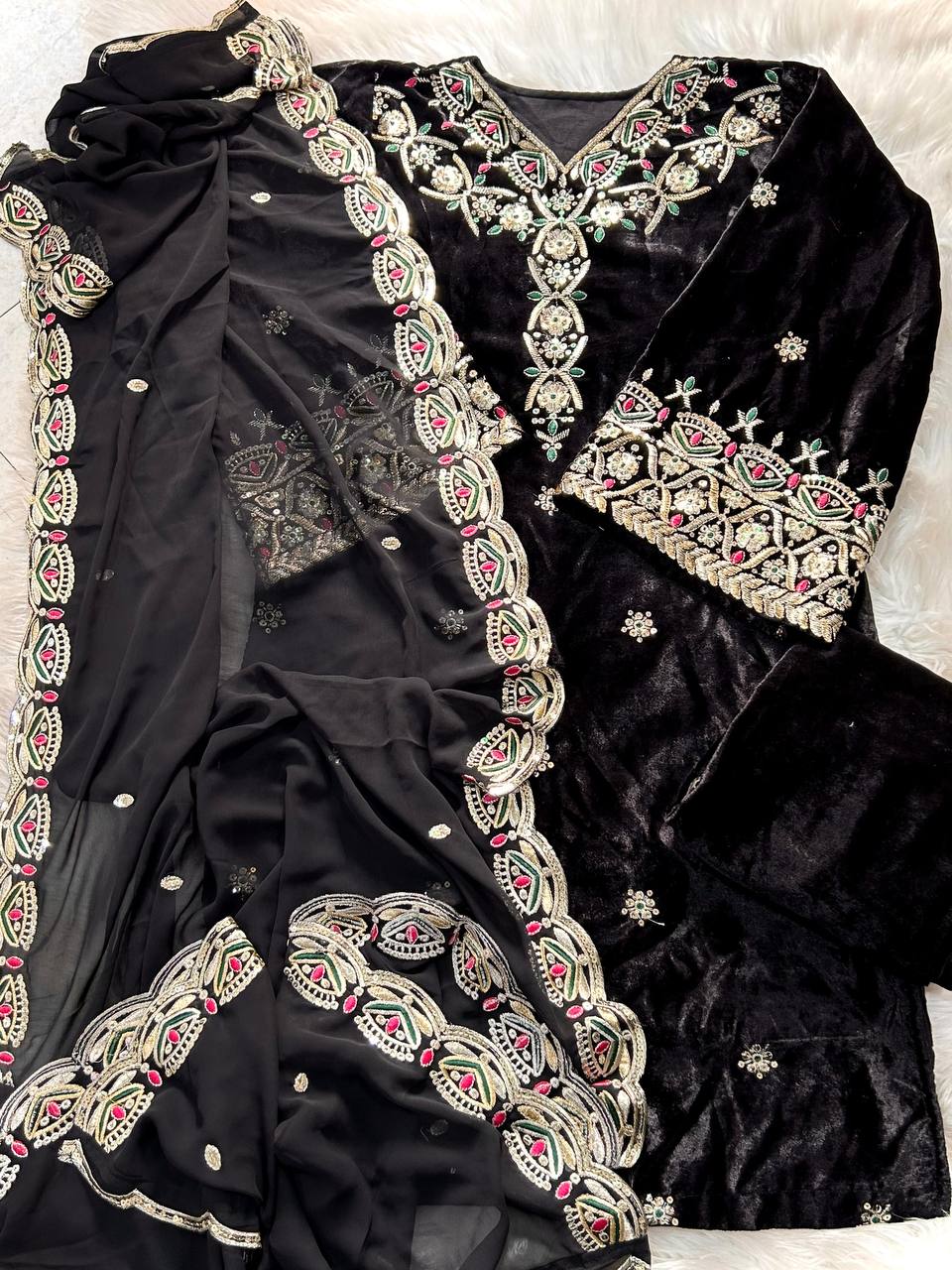 *Top Fabric*:Heavy Pure Viscose Velvet With Embroidery 5 mm Sequence Work With Fancy Bell Sleeve *Top Size* :up to 42 XL Free Size & XXL 44 Margin *(Full Stitched)* *Top Length*:40-41 inches *Top Inner*: Micro Cotton *Bottom Fabric *:Heavy Pure Viscose Velvet With Elastic *Plazzo Length* 40 Inch *(Full Stitched)* *Dupatta Fabric*:Heavy Faux Georgette With Embroidery 5 mm Sequence Work With Cutwork *Dupatta Length:* 2.20 Mtr |