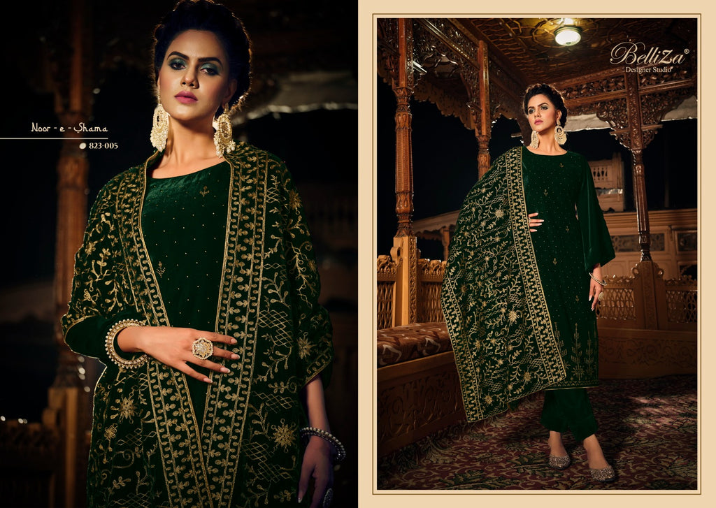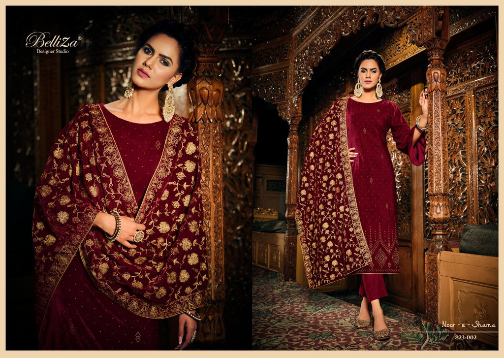 Top: 100% PURE VELVET with Exclusive Heavy Swarovski Work. (2.50 mtrs apx) Dupatta: 100% PURE VELVET with HEAVY EMBROIDERY (2.30 mtrs apx) Bottom: 100% Pure Heavy Winter Twill Pashmina (3 mtrs apx) |
