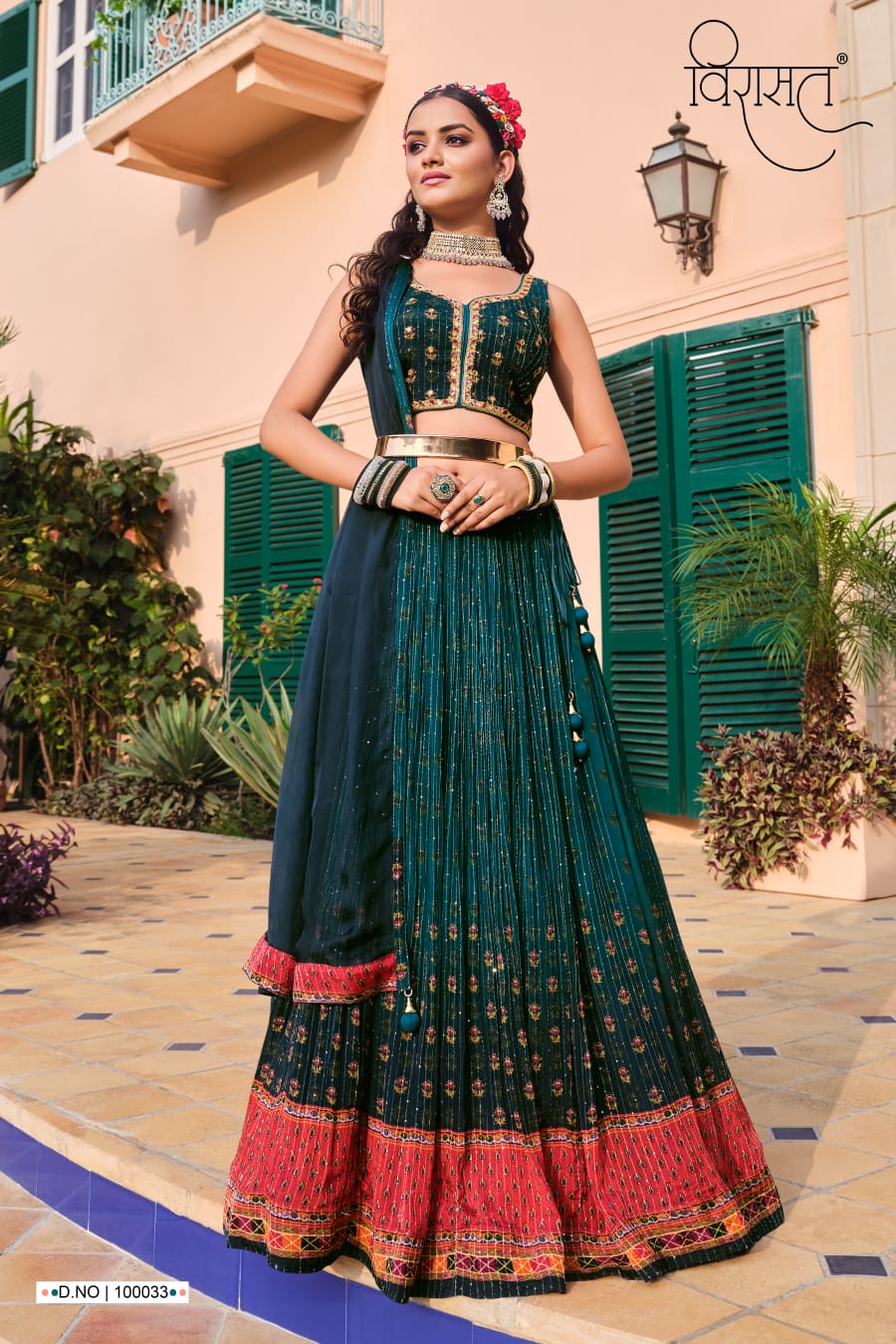Lehenga Fabric : Heavy Pure Chinon Lehenga Work : Sequence work with pure digital print . Blouse Work : Sequence work with Heavy Handwork. Dupatta Work : sequence with latkan. |