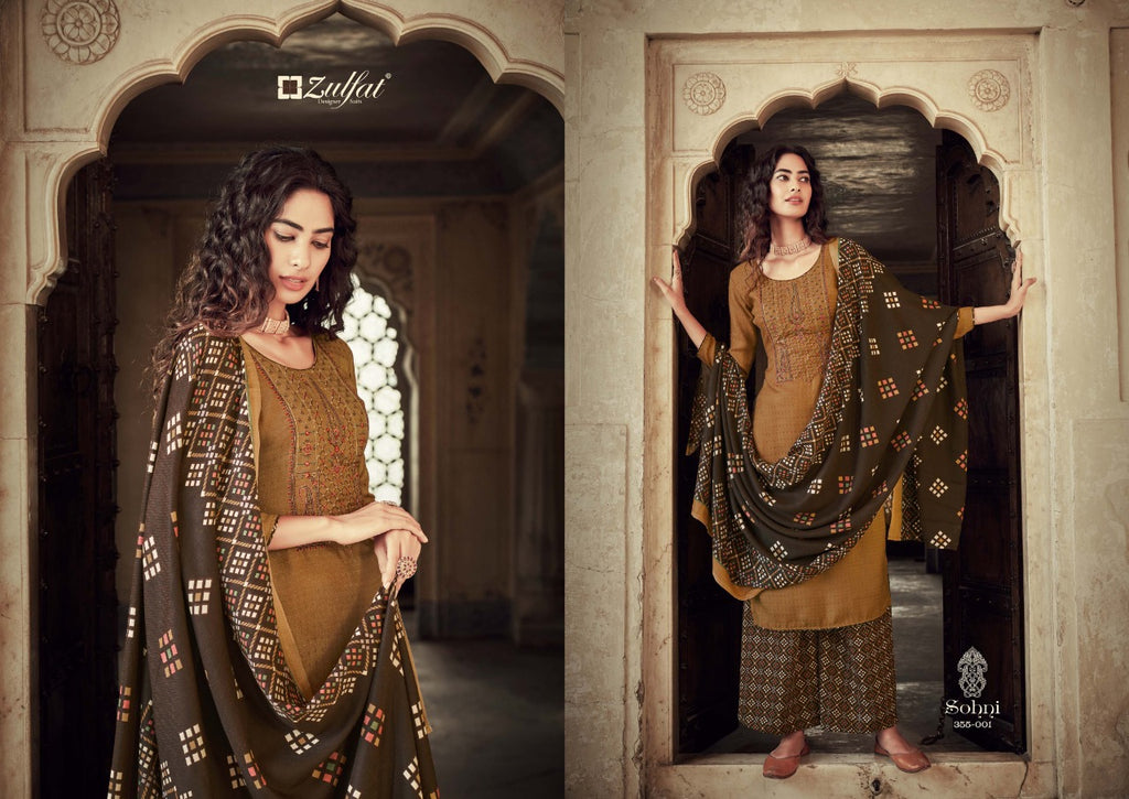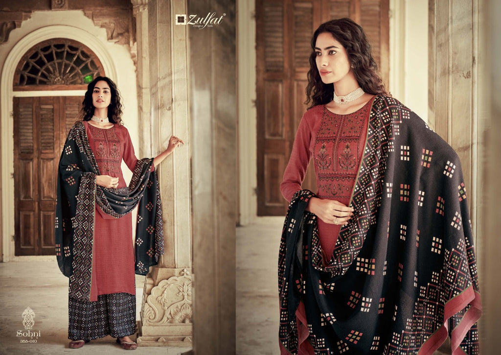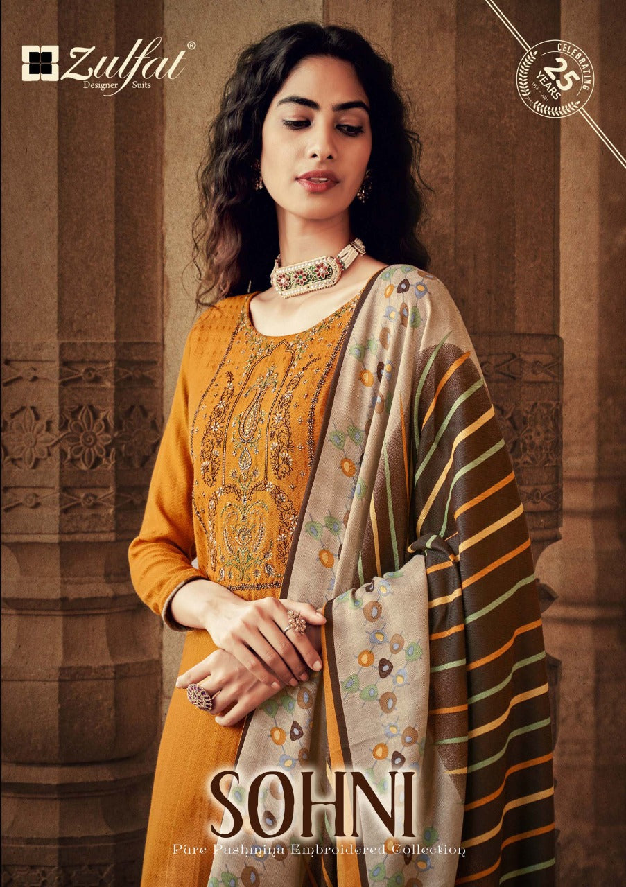 Top: 100% Pure Pashmina Print with Exclusive Embroidery Work. (2.50 mtrs) Dupatta: 100% Pure Pashmina Shawl. (2.30 mtr) Bottom: 100% Pure Pashmina Printed Salwar (3 mtrs apx) Pcs: 10 |