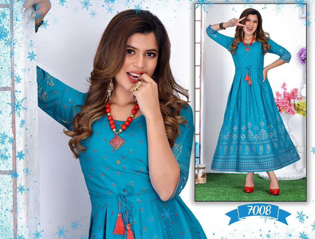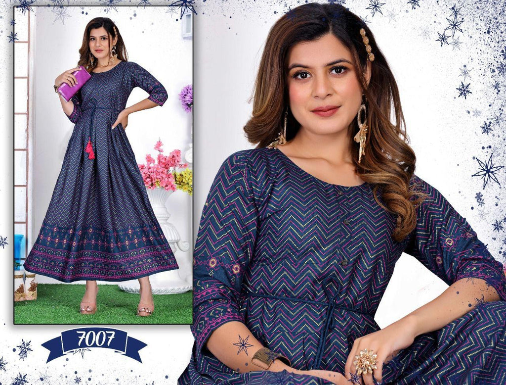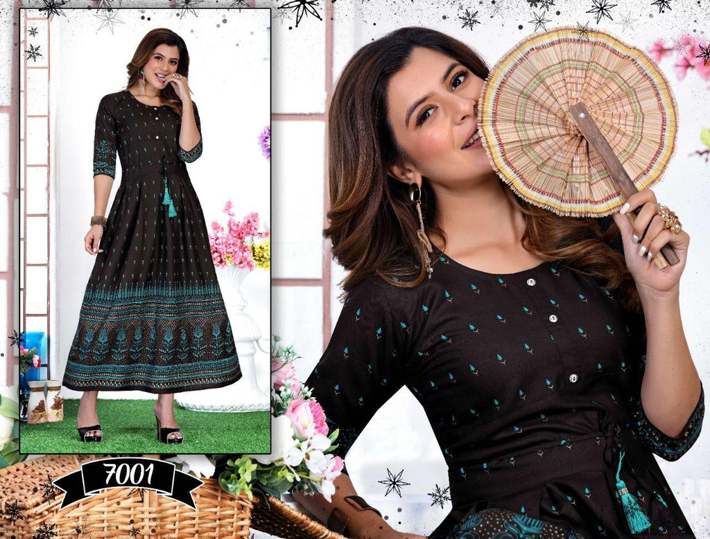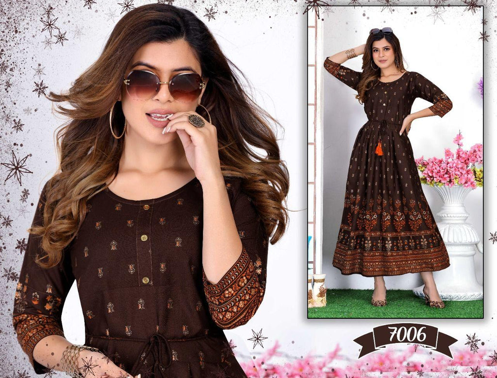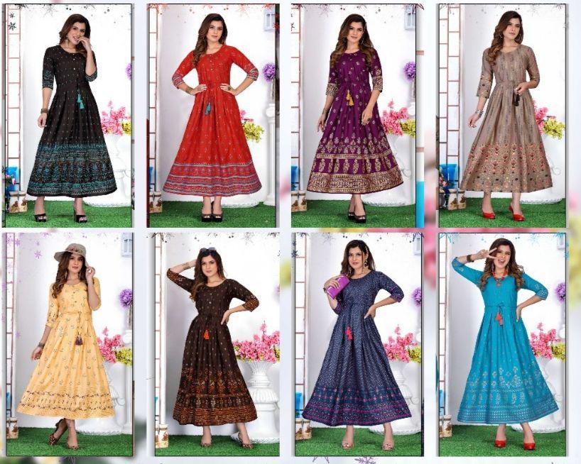 Golden Albeli Rayon Foil Printed Fancy Gown Style Party Wear Kurtis
