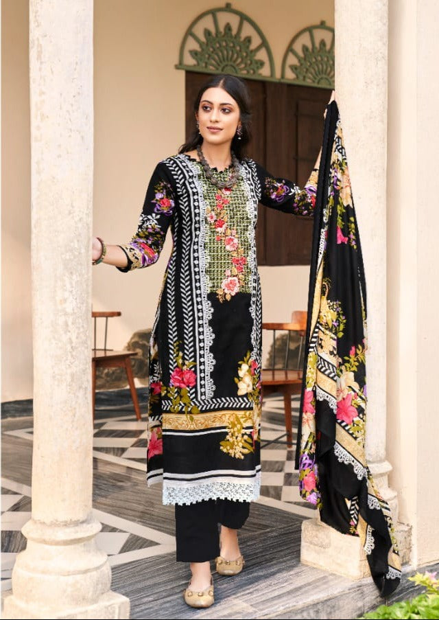 Top: cambric Cotton Pakistani Print with Fancy Self Embroidery & Daman Lace with Swarovski Diamond Work Bottom: Pure Cotton Solid Dupatta: Cotton Print Dup |