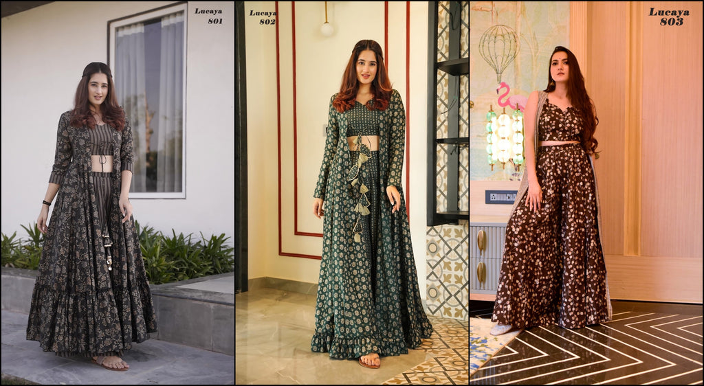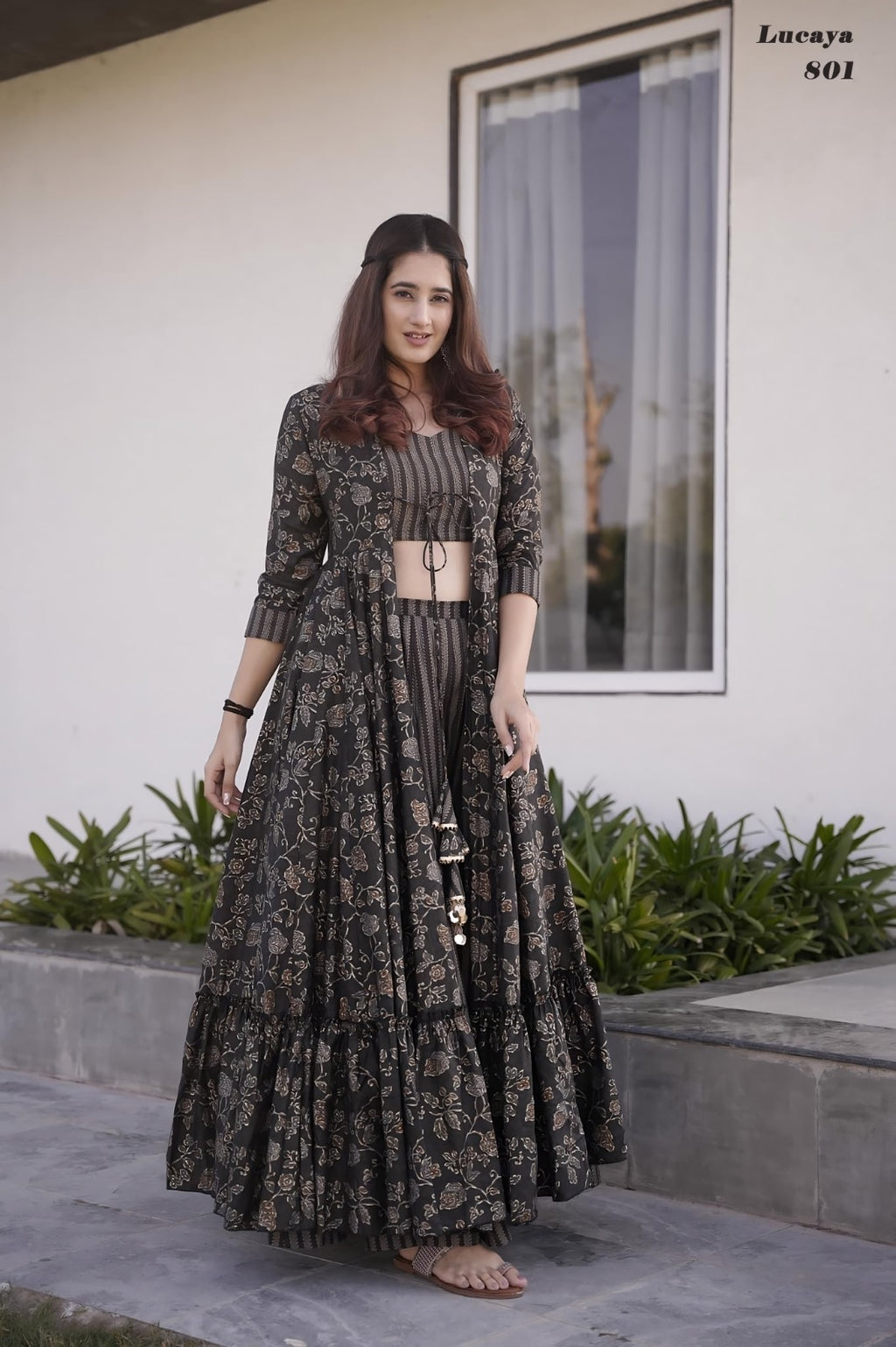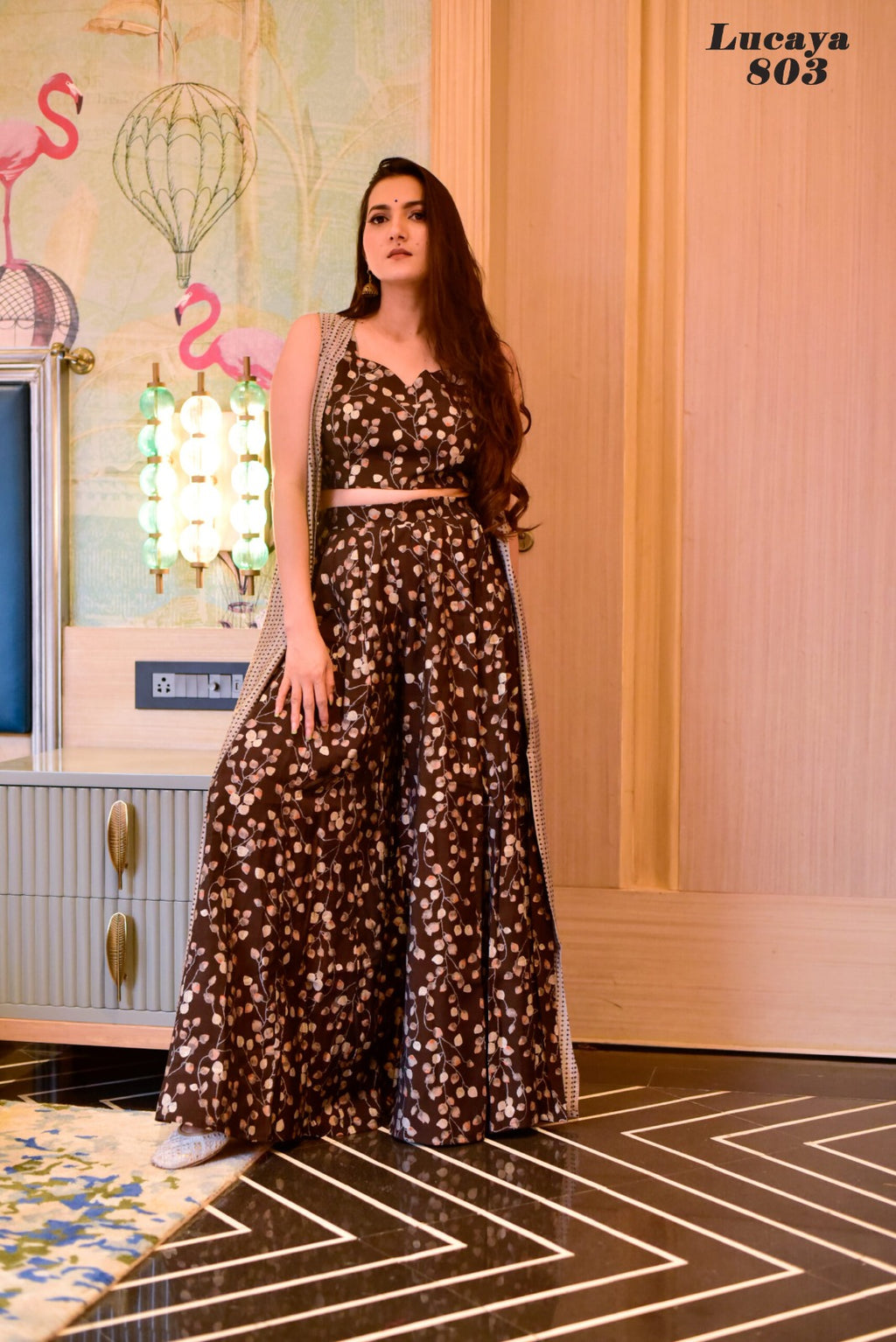 Pack Contains: 1 crop top,1 palazzo,1 shrug Pattern: Digital print Fabric: muslin Top length: – 14-15” Palazzo length: – 38-40” Shrug fabric: muslin Shrug length: – 55” Colour: Charcoal black, deep green, brown |