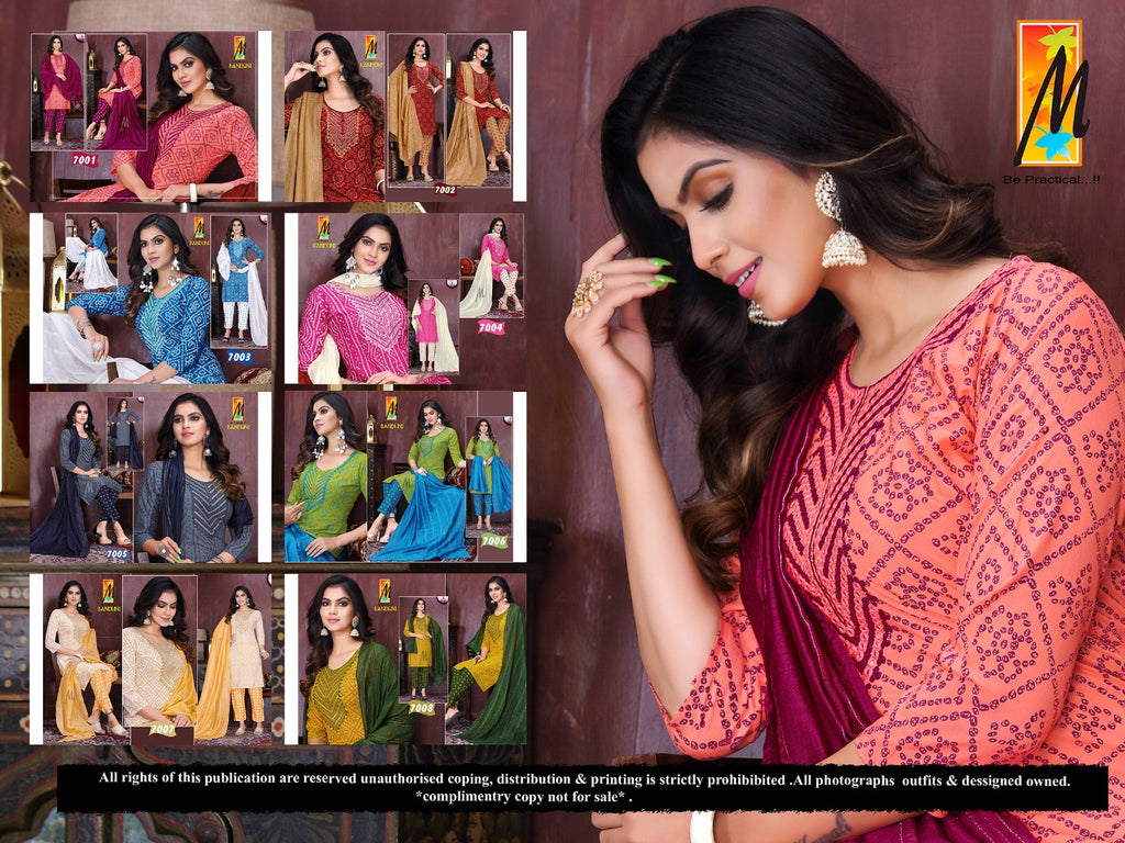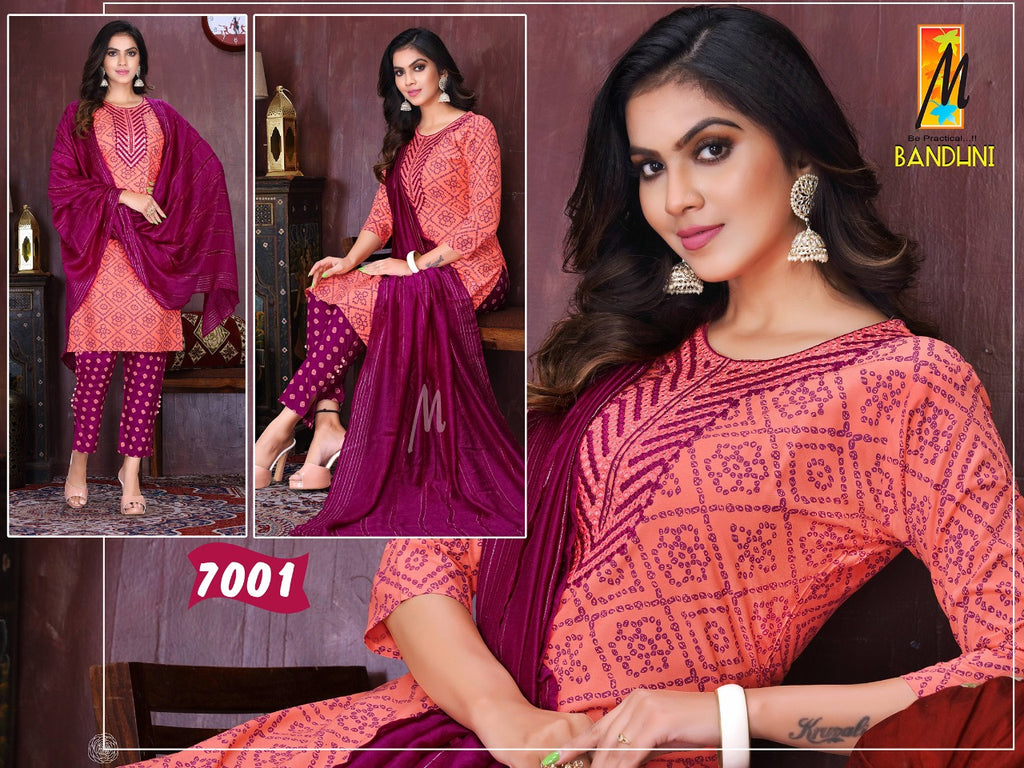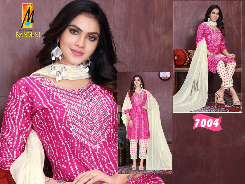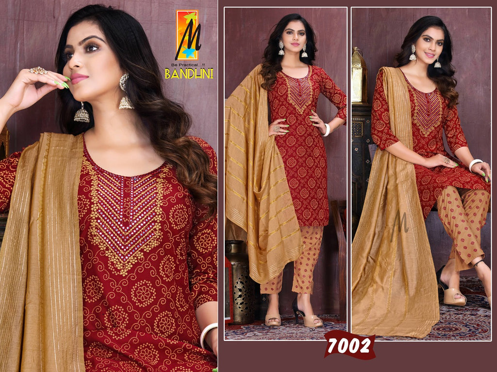 Top, Pant, Dupatta Top: Heavy Rayon With Bandhni Print With Mirror And Embroidery Neck Pant: Heavy Rayon With Bandhni Print With Pocket And Silai Pattern Dupatta: Heavy Fancy Chanderi Total Designs: 8 Sizes: L, XL,XXL |