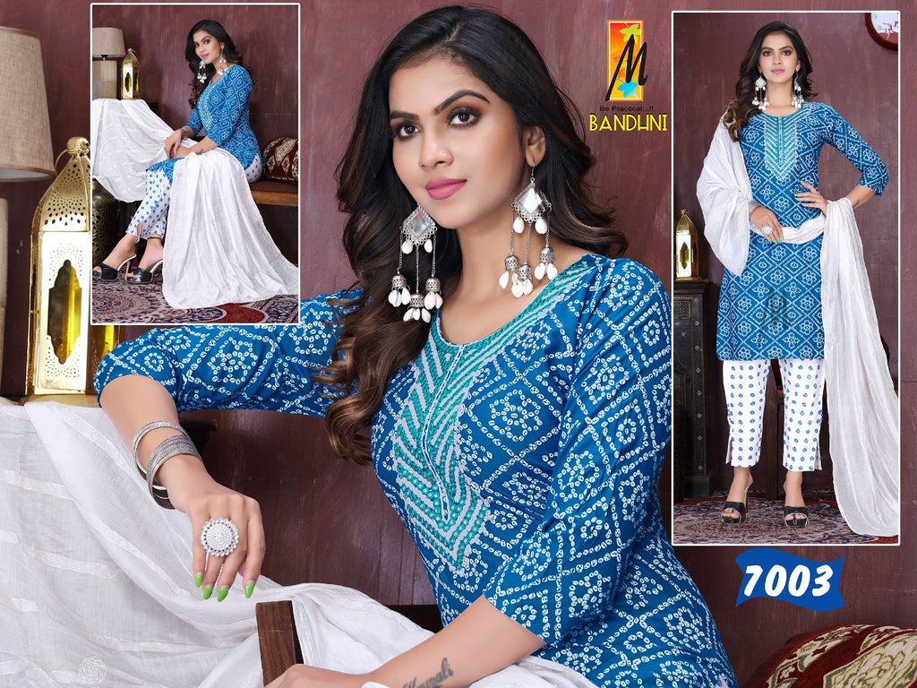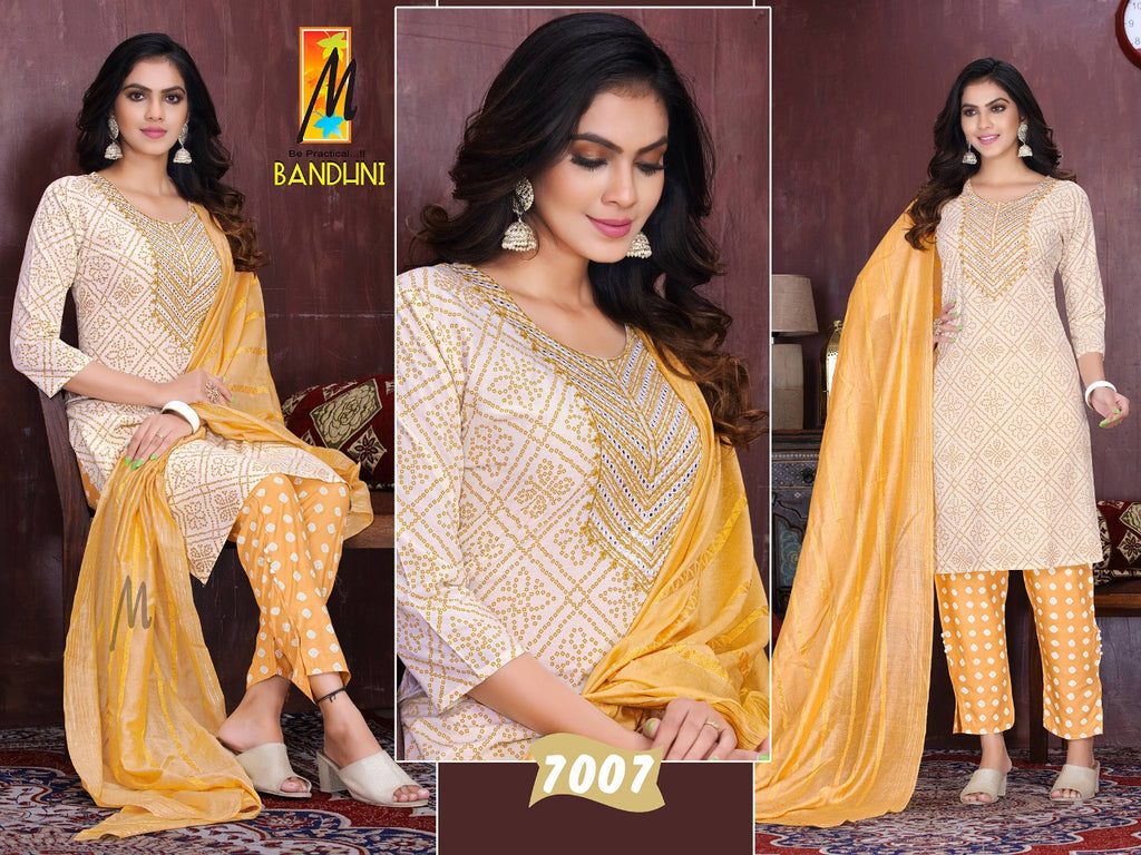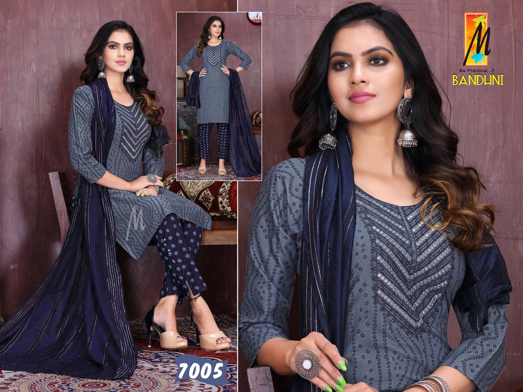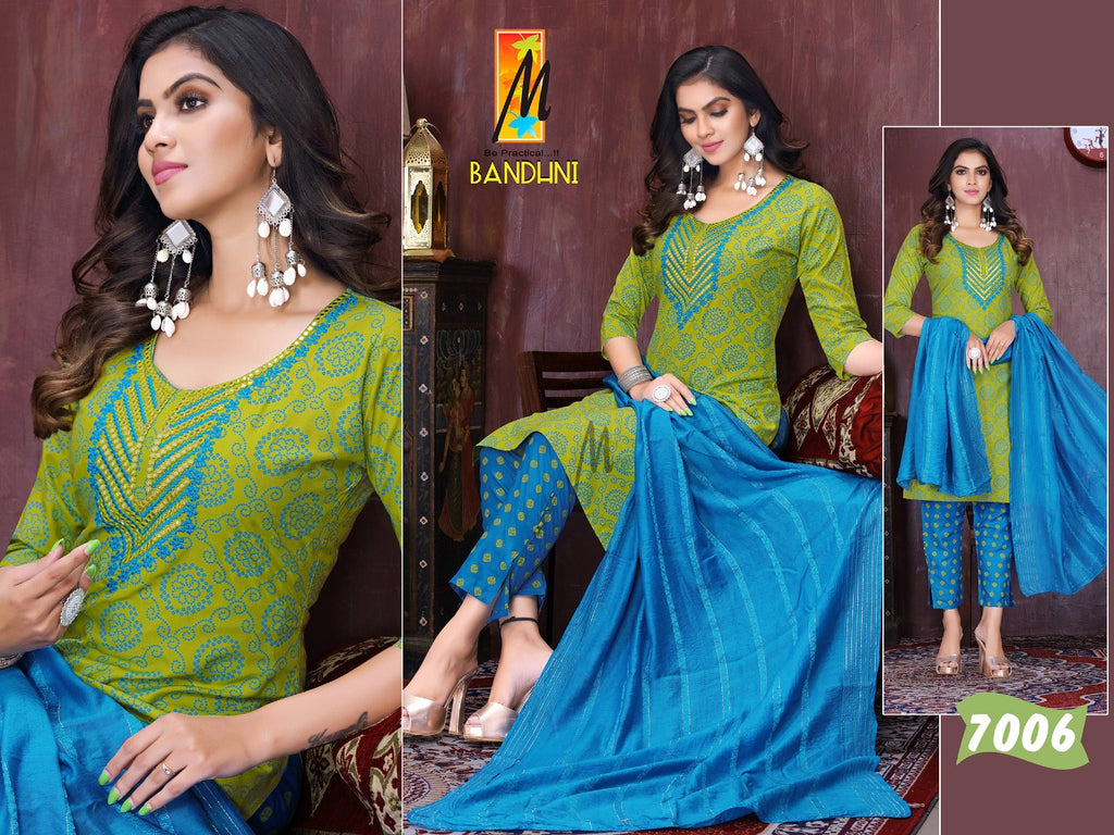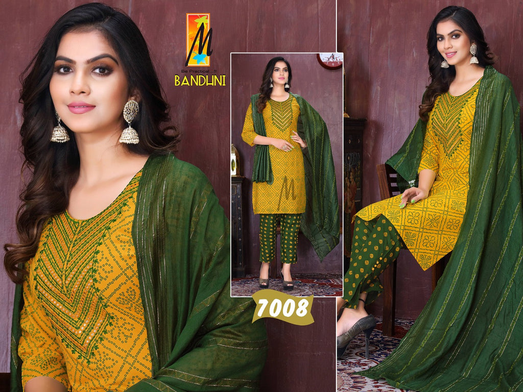 Top, Pant, Dupatta Top: Heavy Rayon With Bandhni Print With Mirror And Embroidery Neck Pant: Heavy Rayon With Bandhni Print With Pocket And Silai Pattern Dupatta: Heavy Fancy Chanderi Total Designs: 8 Sizes: L, XL,XXL |