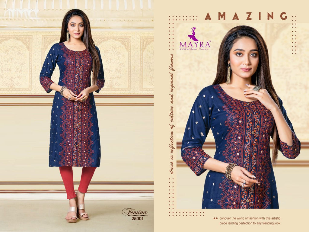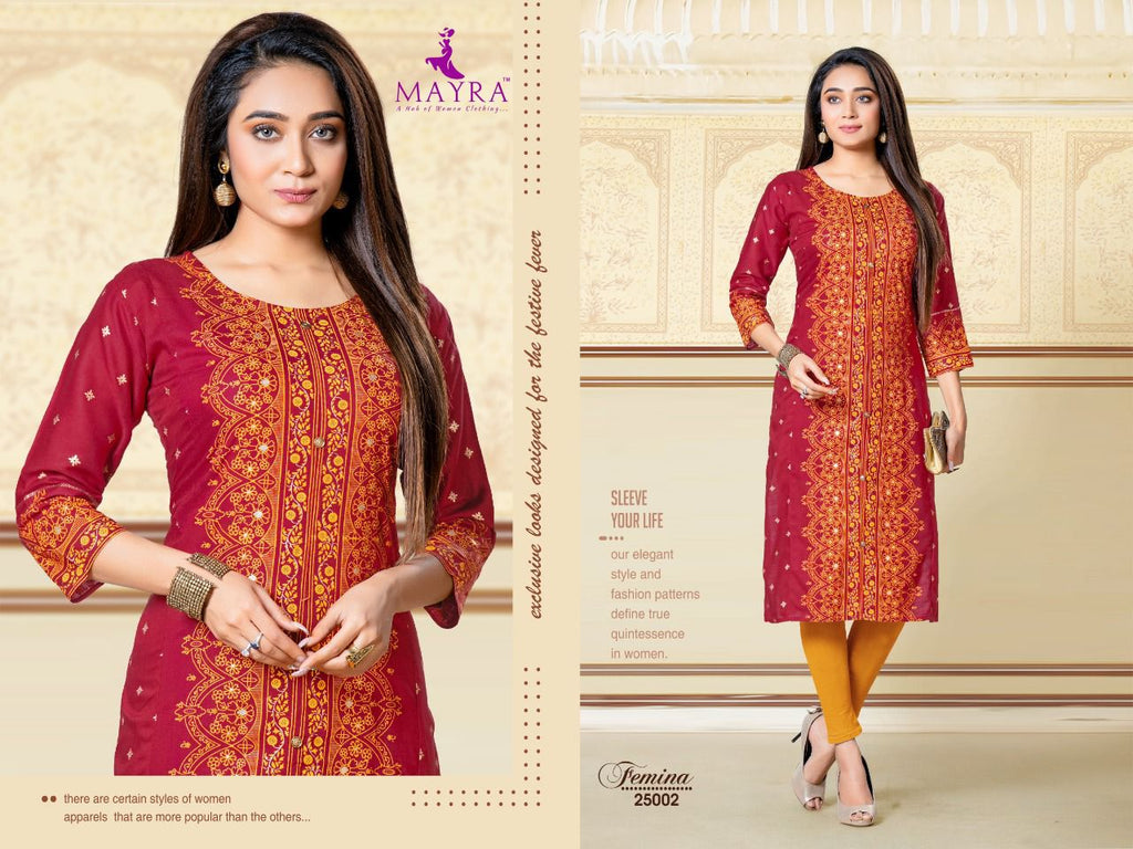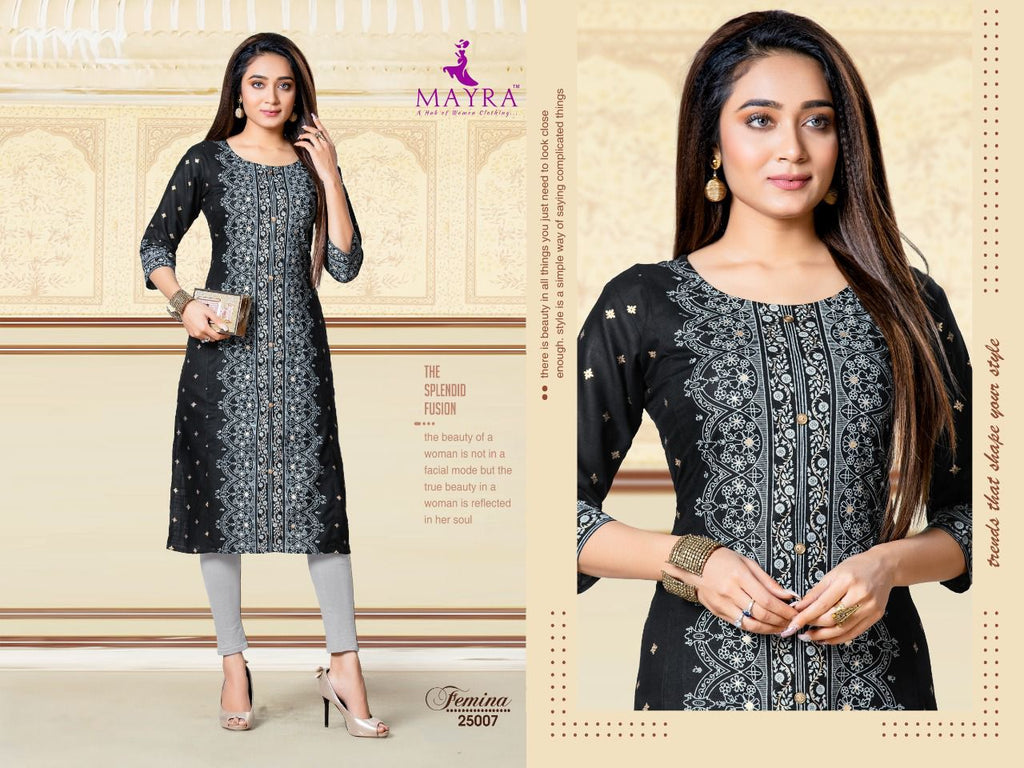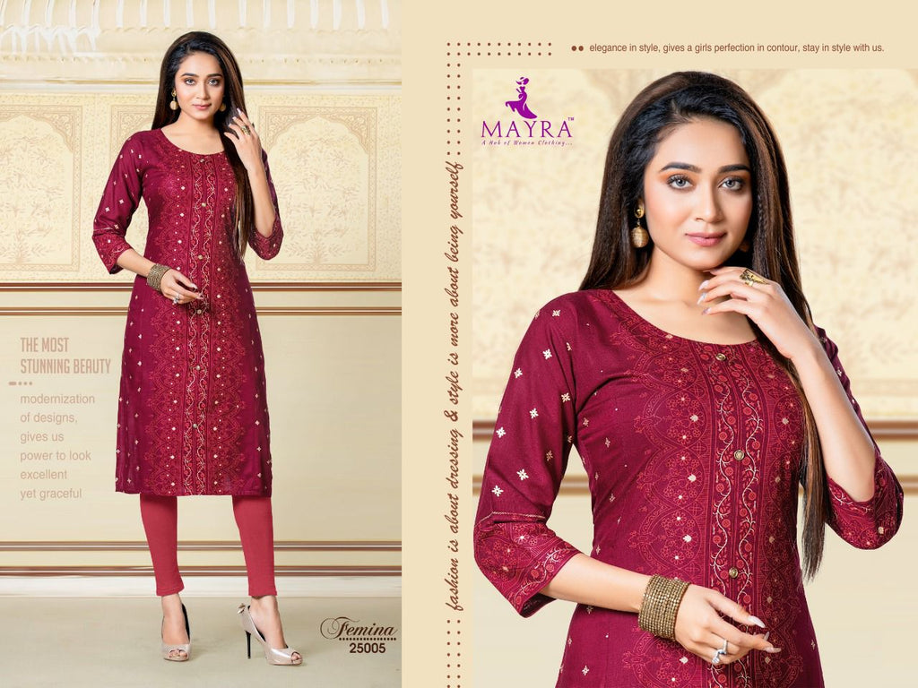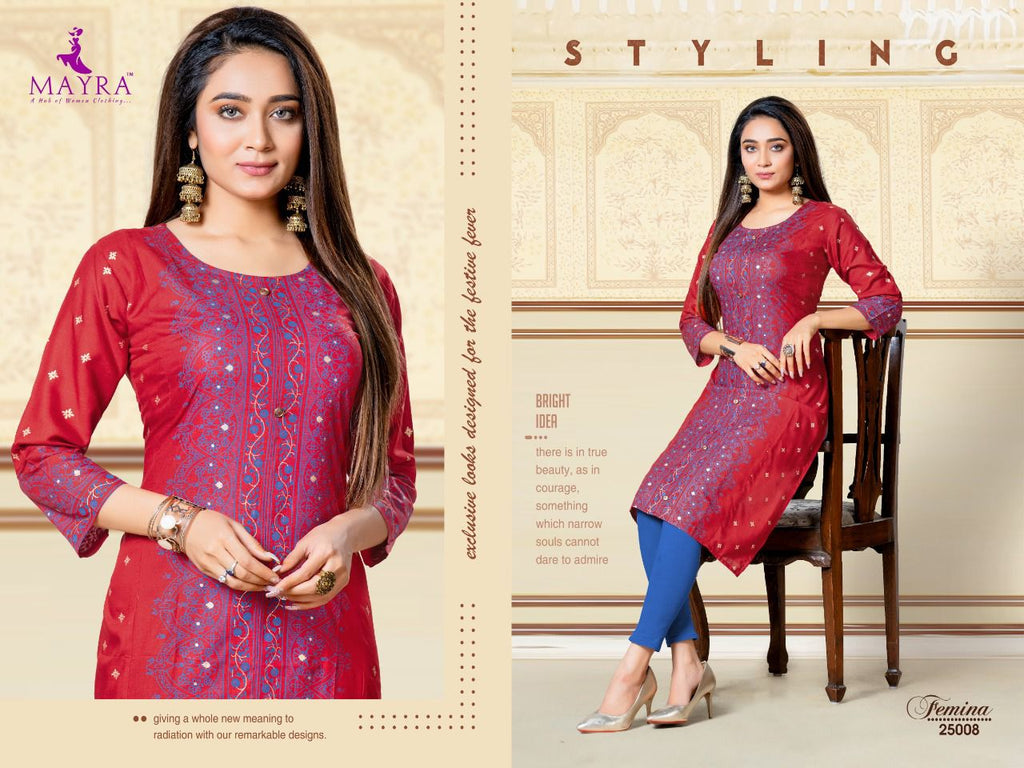 Mayra Femina Rayon Slub Party Wear Kurtis With Screen Foil Print