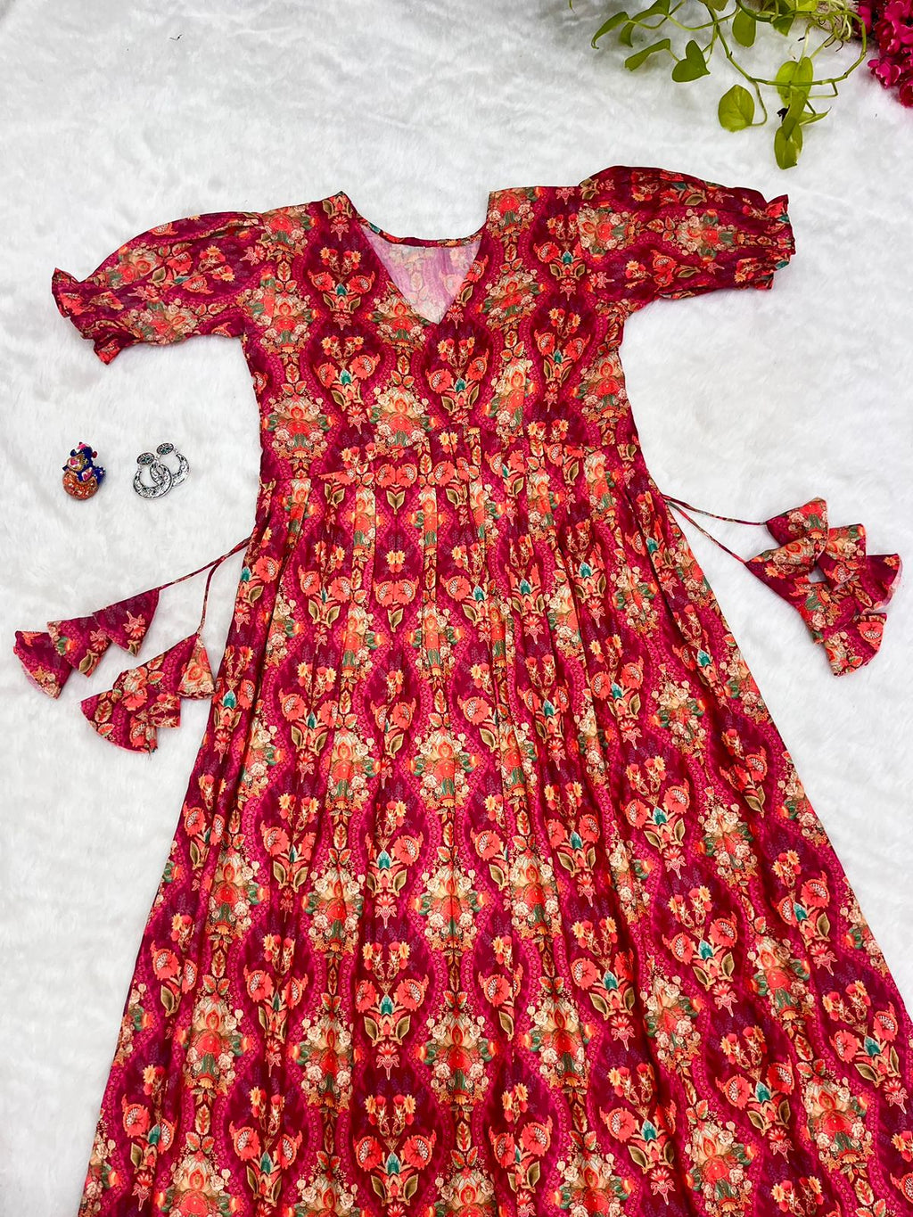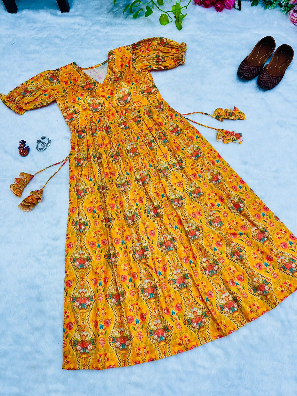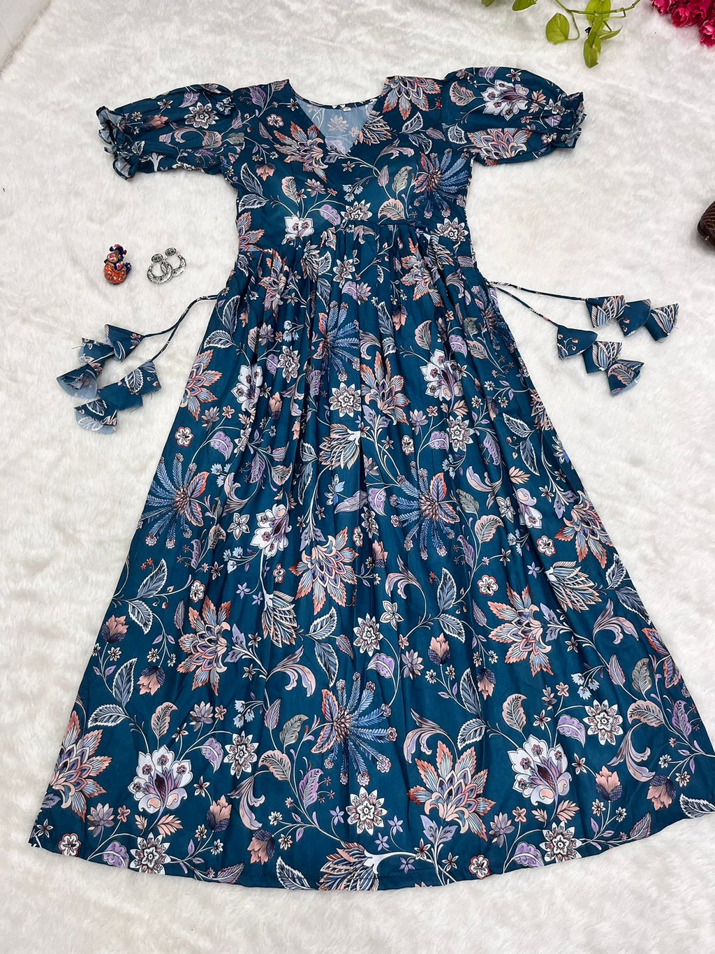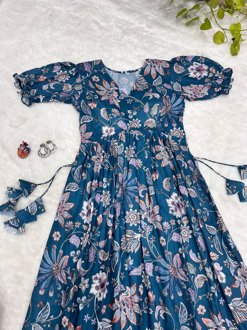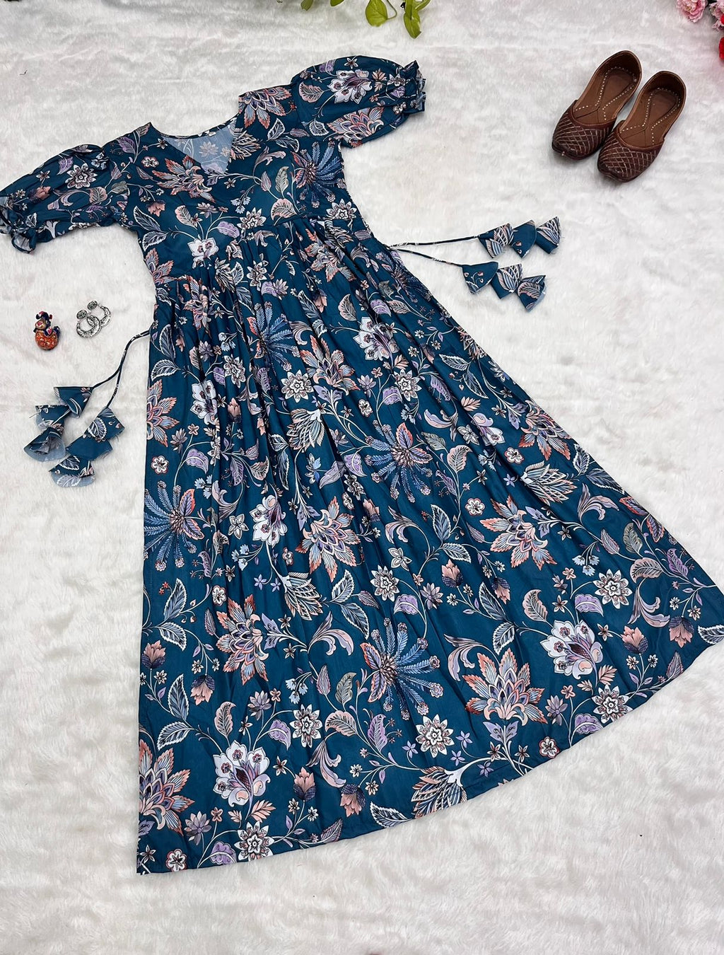 FABRIC- BSY SOFT PRINTED MUSLIN ALIACUT KURTI, FANCY PUFF SLEEVE , SIDE WAIST FANCY FANCY FUMKA , SAID FULL CUT |