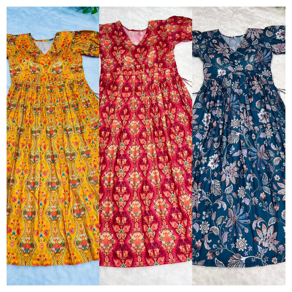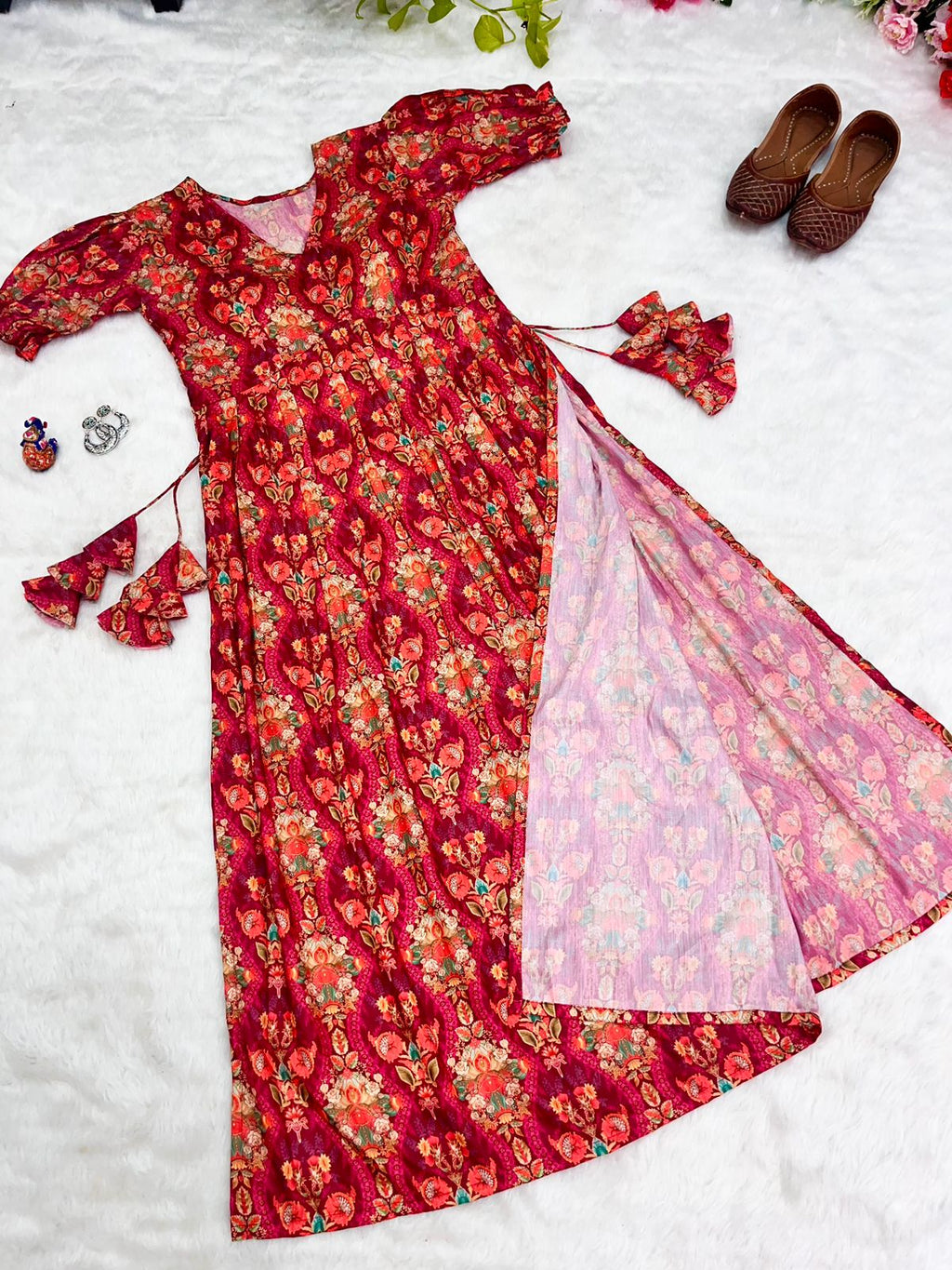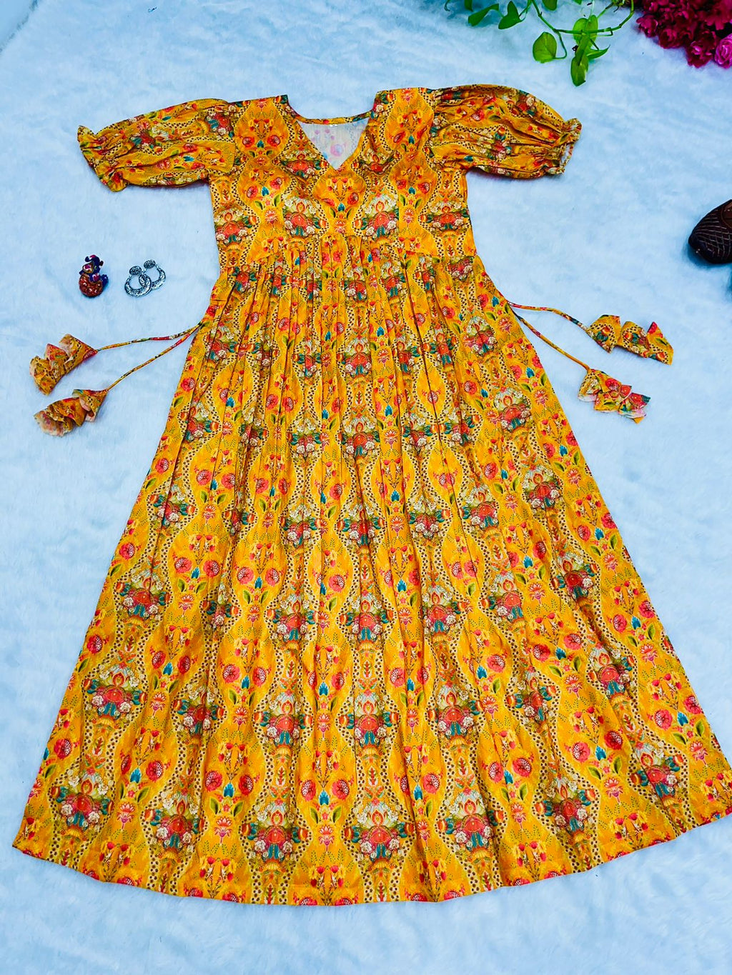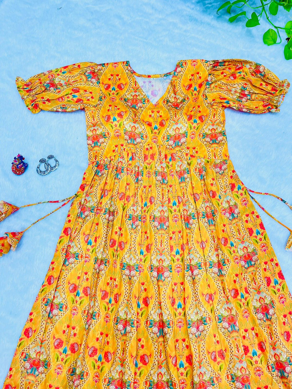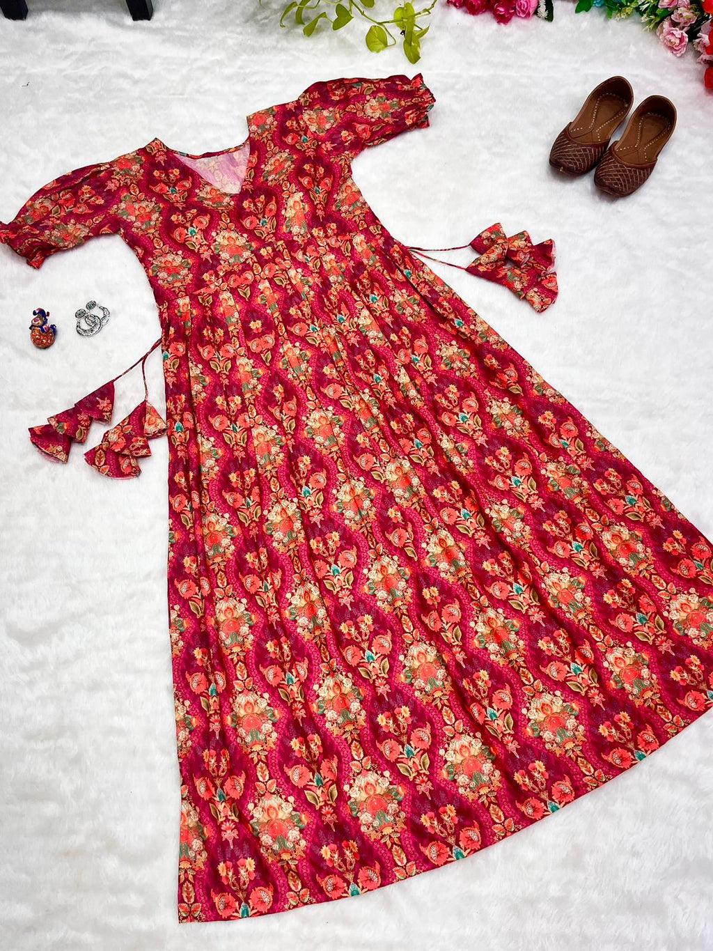 FABRIC- BSY SOFT PRINTED MUSLIN ALIACUT KURTI, FANCY PUFF SLEEVE , SIDE WAIST FANCY FANCY FUMKA , SAID FULL CUT |