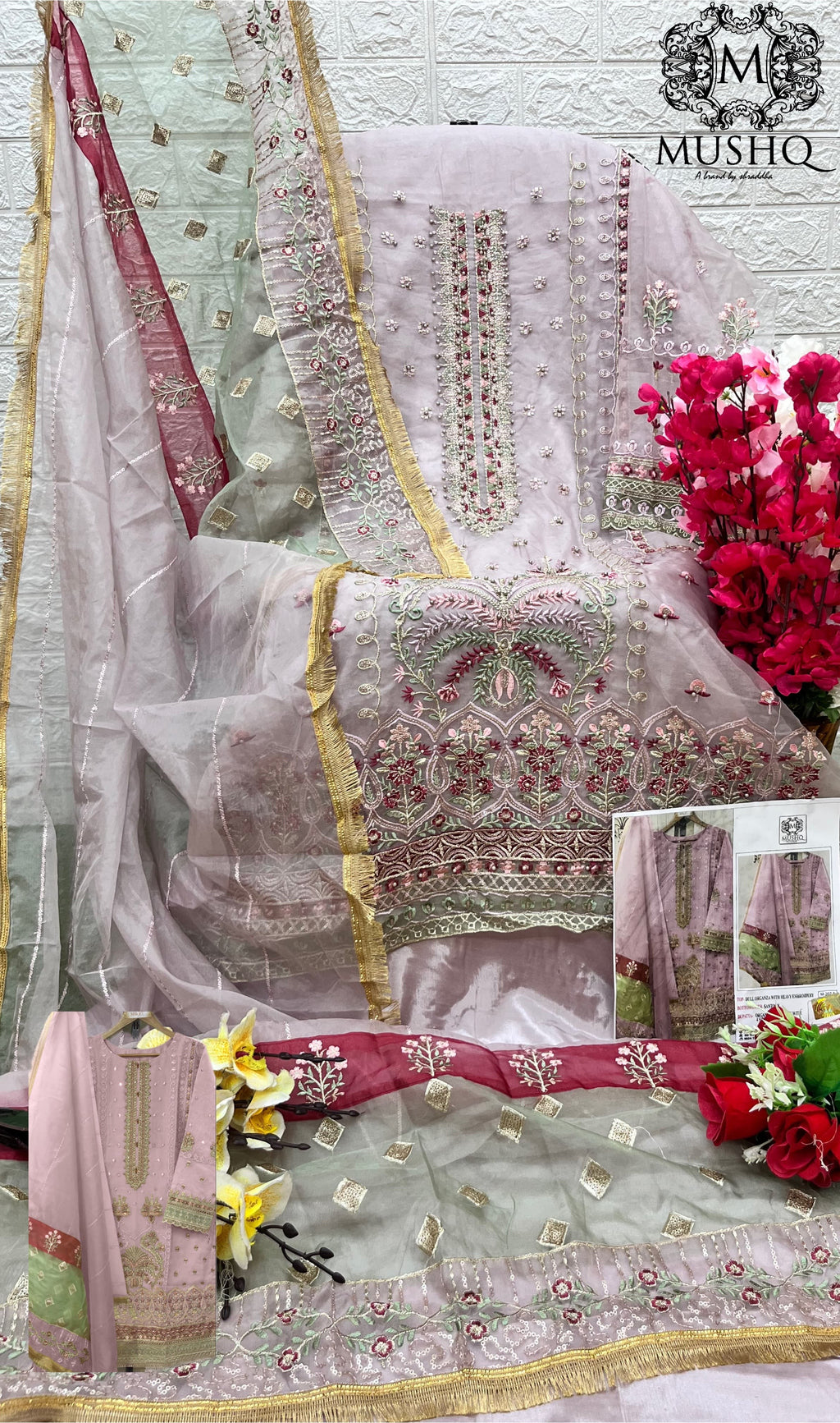 Top :- PURE ORGANZA EMBROIDERED WORK WITH Moti work Dupatta :- PURE Orngza WITH EMBROIDERY WORK with cutwork INNER:- SANTOON Bottom :- SANTOON |
