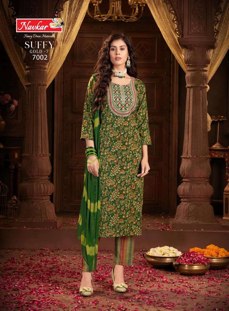 Navkar Suffy Gold Vol 7 Rayon Foil Print Embroidery Work Casual Wear Kurti Pant Dupatta Set