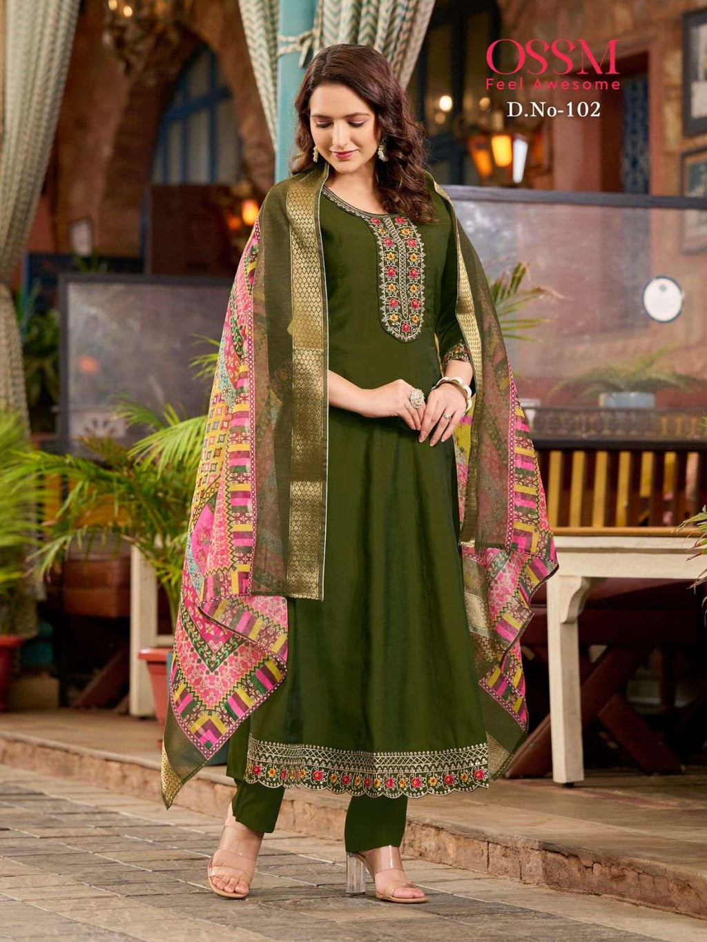 Ossm Resham Viscose Silk Heavy Embroidery Flair Kurti Pant Dupatta Set