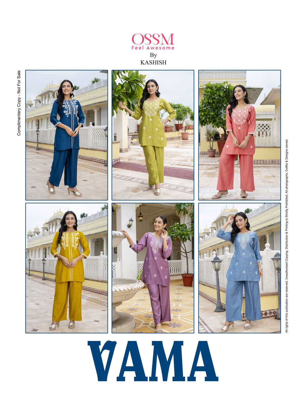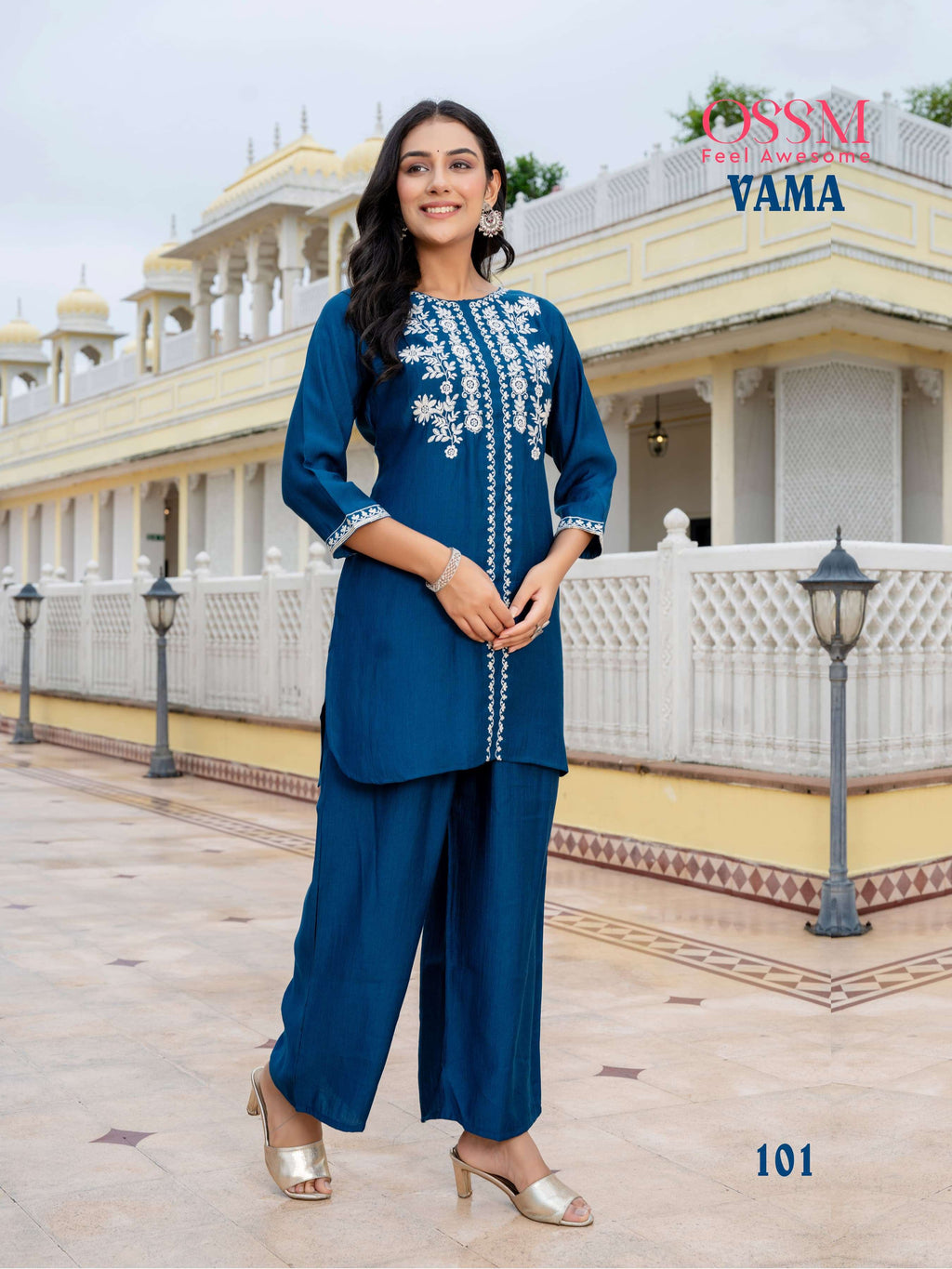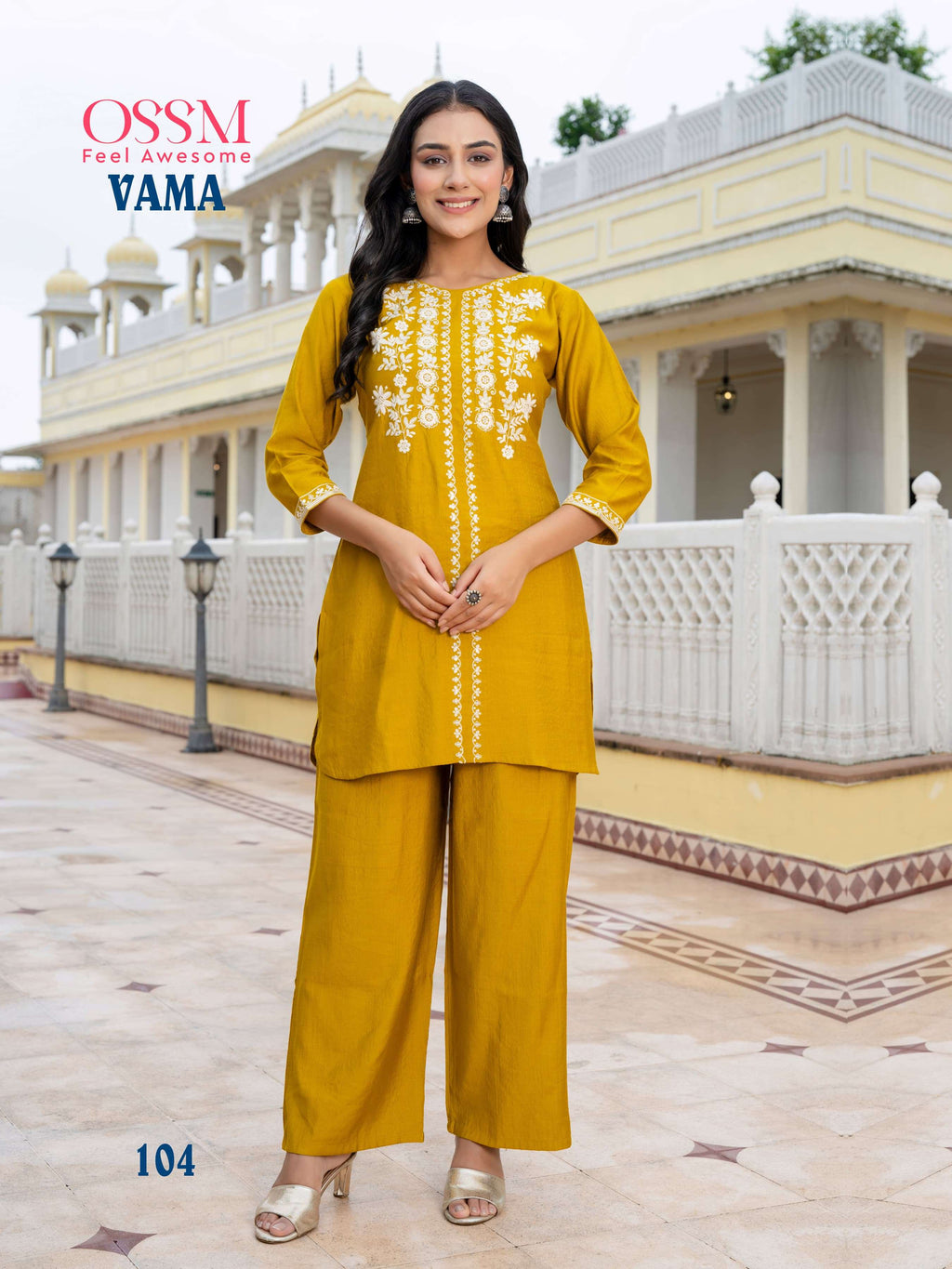 Ossm Vama Viscose Silk Heavy Embroidery Fancy Casual Wear Short Kurti Pant Set