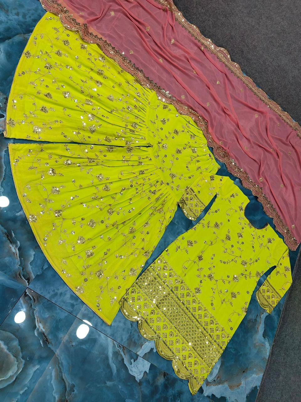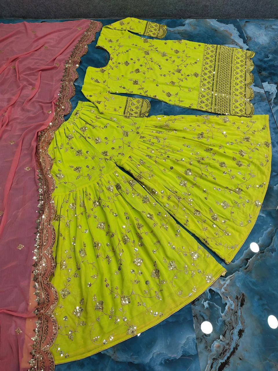 *Top Fabric * :Faux Georgette With Heavy Embroidery And 5mm Siquence Work With Sleeves *Plazzo Fabric * : Faux Georgette With Heavy 5mm Siquence Work *Dupatta Fabric* :Faux Georgette With Embroidery Work and Embroidery Lace Border |