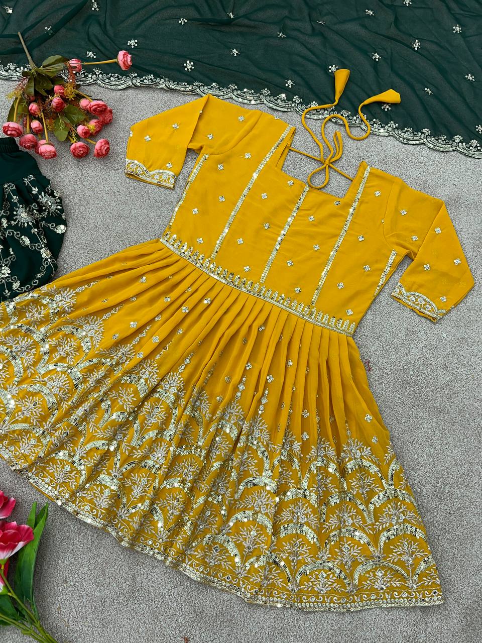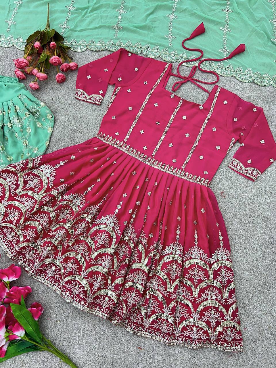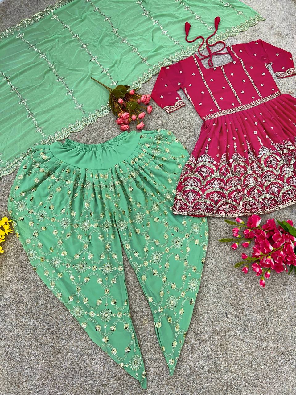 *Top Fabric * :Heavy Faux Georgette With Heavy Embroidery And 5mm Sequence Work With Fancy Sleeves *Top Inner * :Heavy Micro Cotton *Top Length * :34-35Inch *Top Size*. :M(38),L(40),XL(42),XXL(44)*Fully Stitched Ready To Wear* *Dhoti Salvar*Fabrics* :Heavy Faux Georgette With 5mm Embroidery Sequence Work With Fully Flair *Dhoti inner* :Heavy Micro Cotton *Dupatta* *Dupatta Fabric * :Heavy Faux Georgette With 5mm Embroidery Sequence Work and Lace Border |