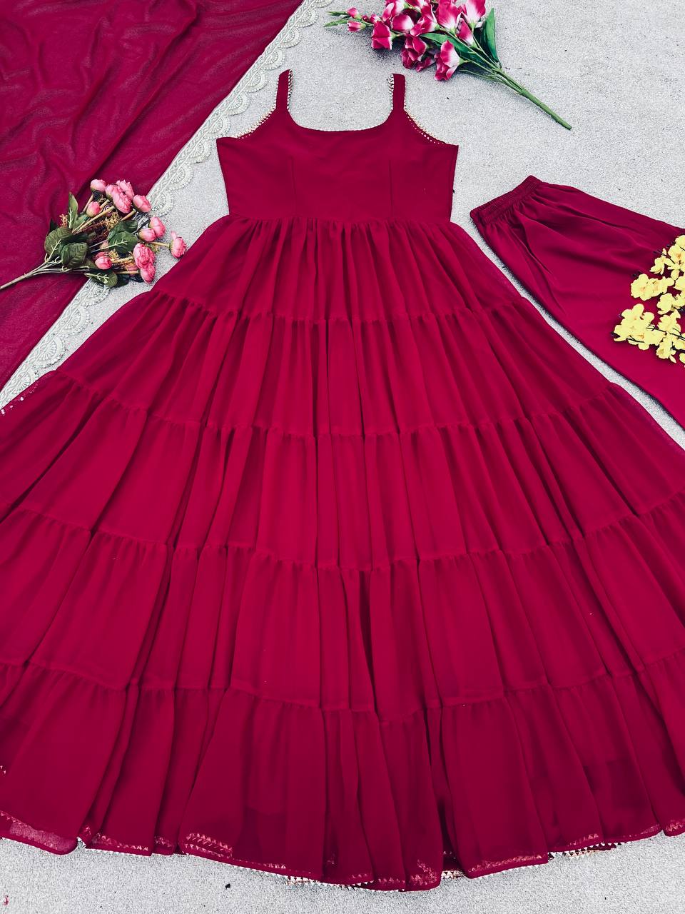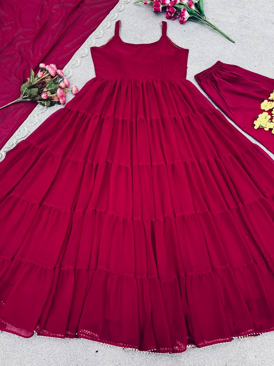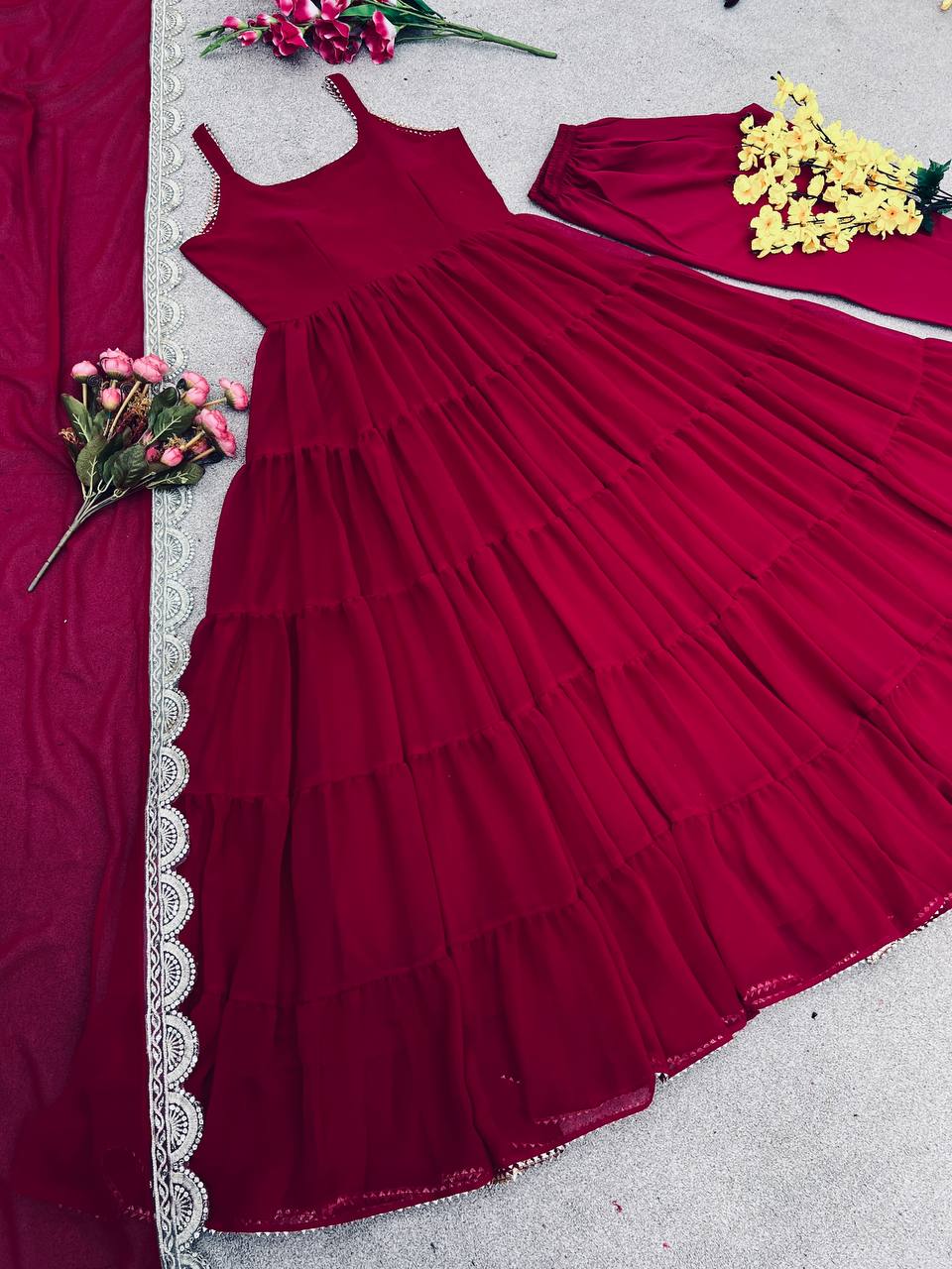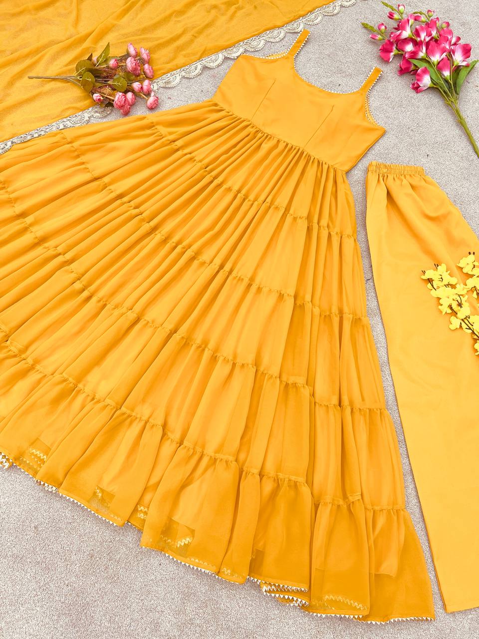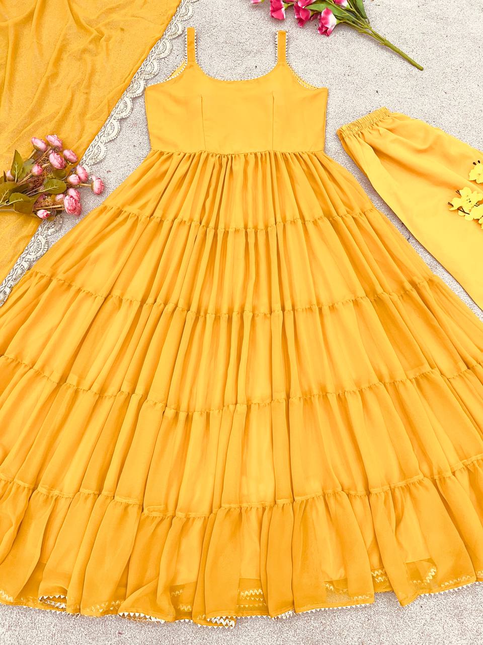 *Top Fabric*:Heavy Georgette With attached Pad With Extra Sleeve Fabric and *Fully 10 Meter Ruffle Flair* *Bottom*: Micro Cotton (Full Stiched) *Dupatta Fabric*: Heavy Georgette Embroidery Sequence Work lace Border |