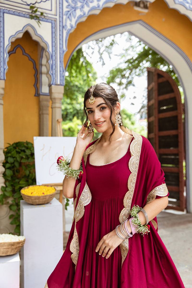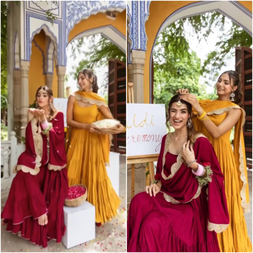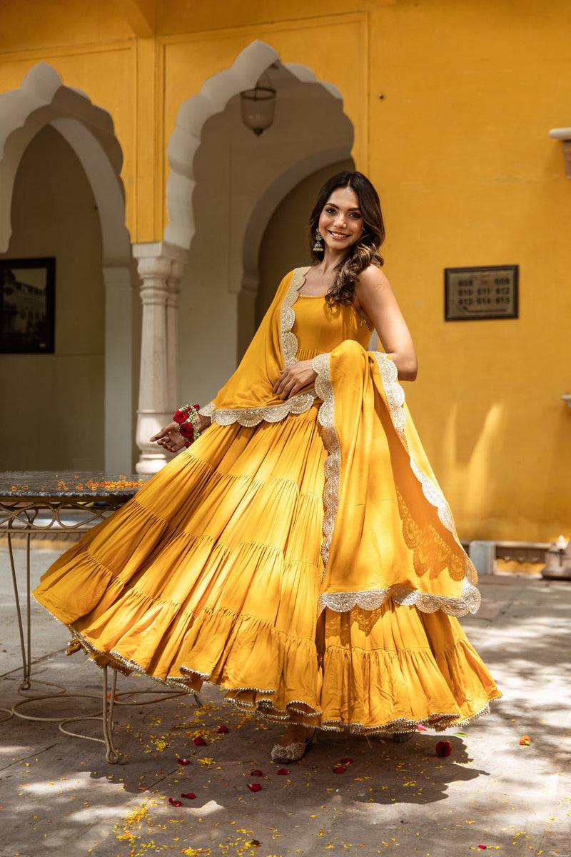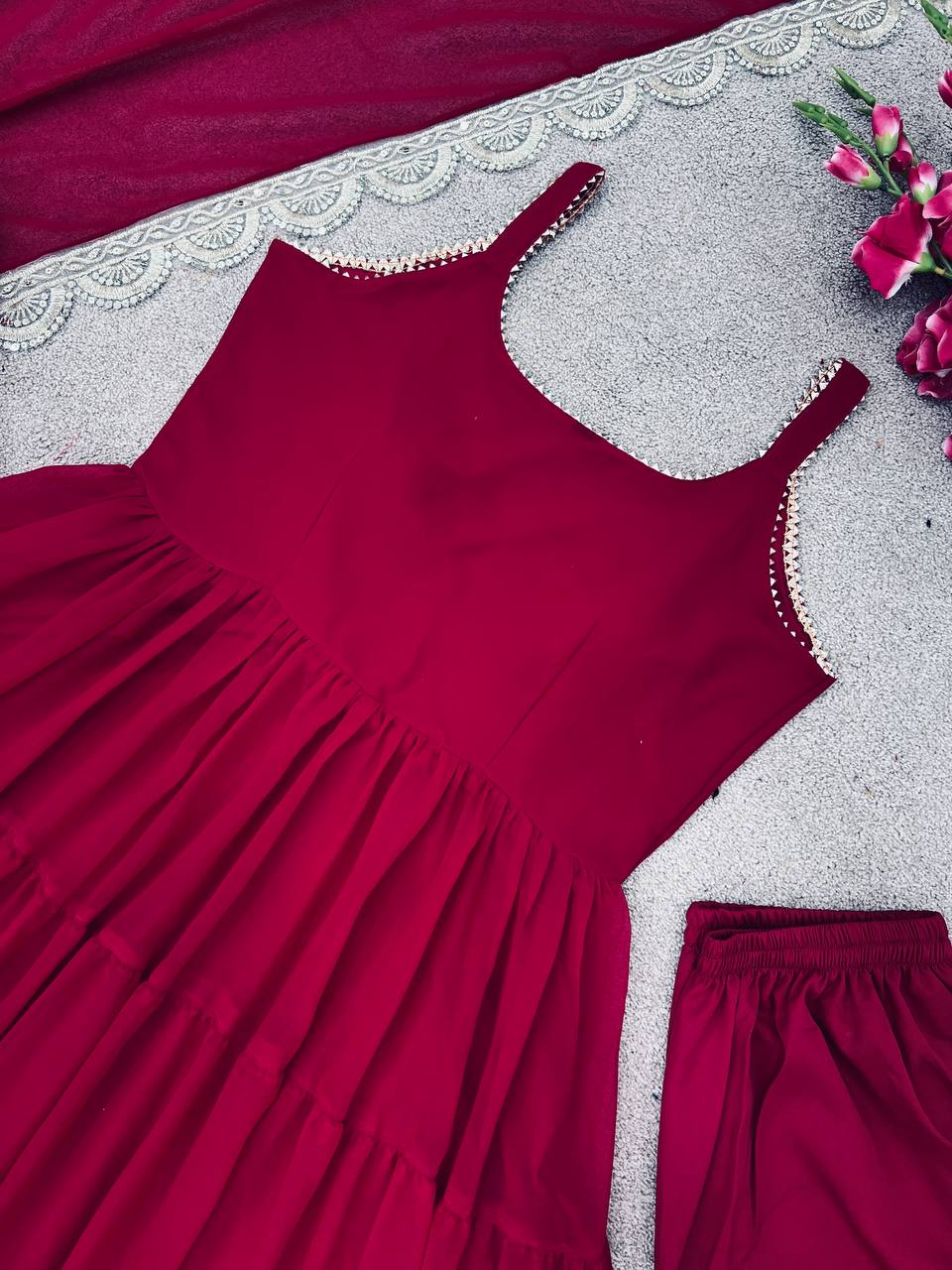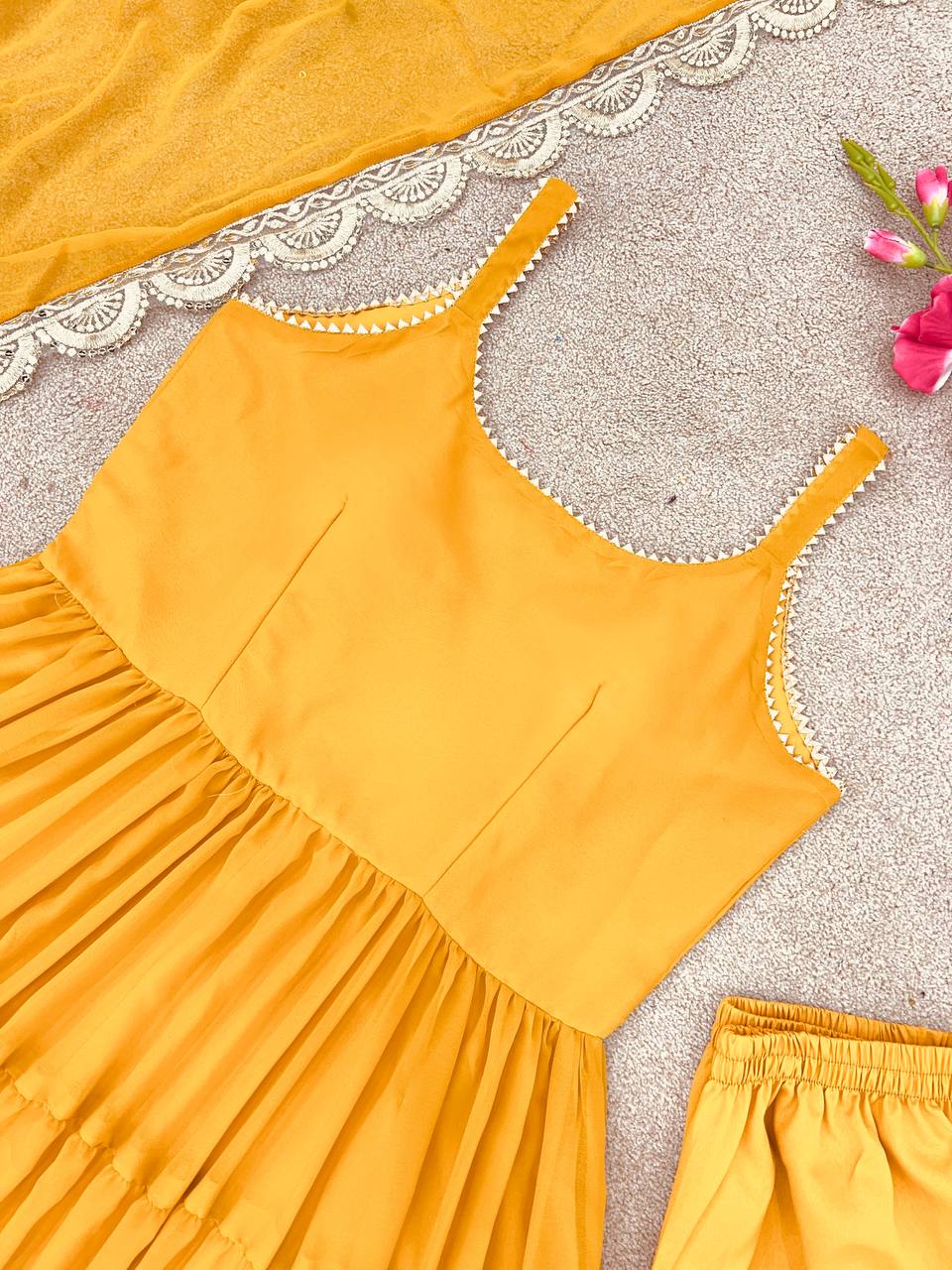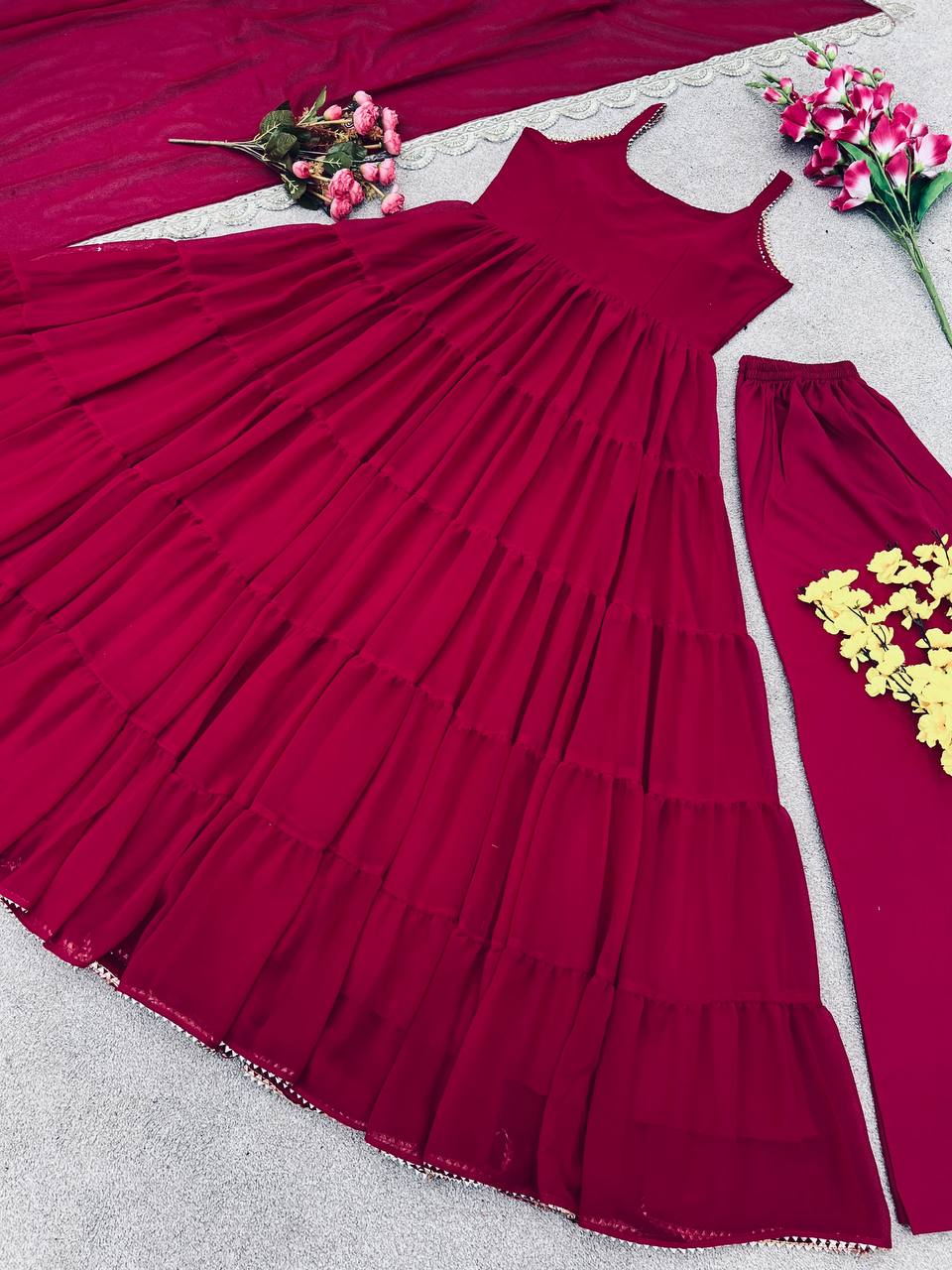*Top Fabric*:Heavy Georgette With attached Pad With Extra Sleeve Fabric and *Fully 10 Meter Ruffle Flair* *Bottom*: Micro Cotton (Full Stiched) *Dupatta Fabric*: Heavy Georgette Embroidery Sequence Work lace Border |