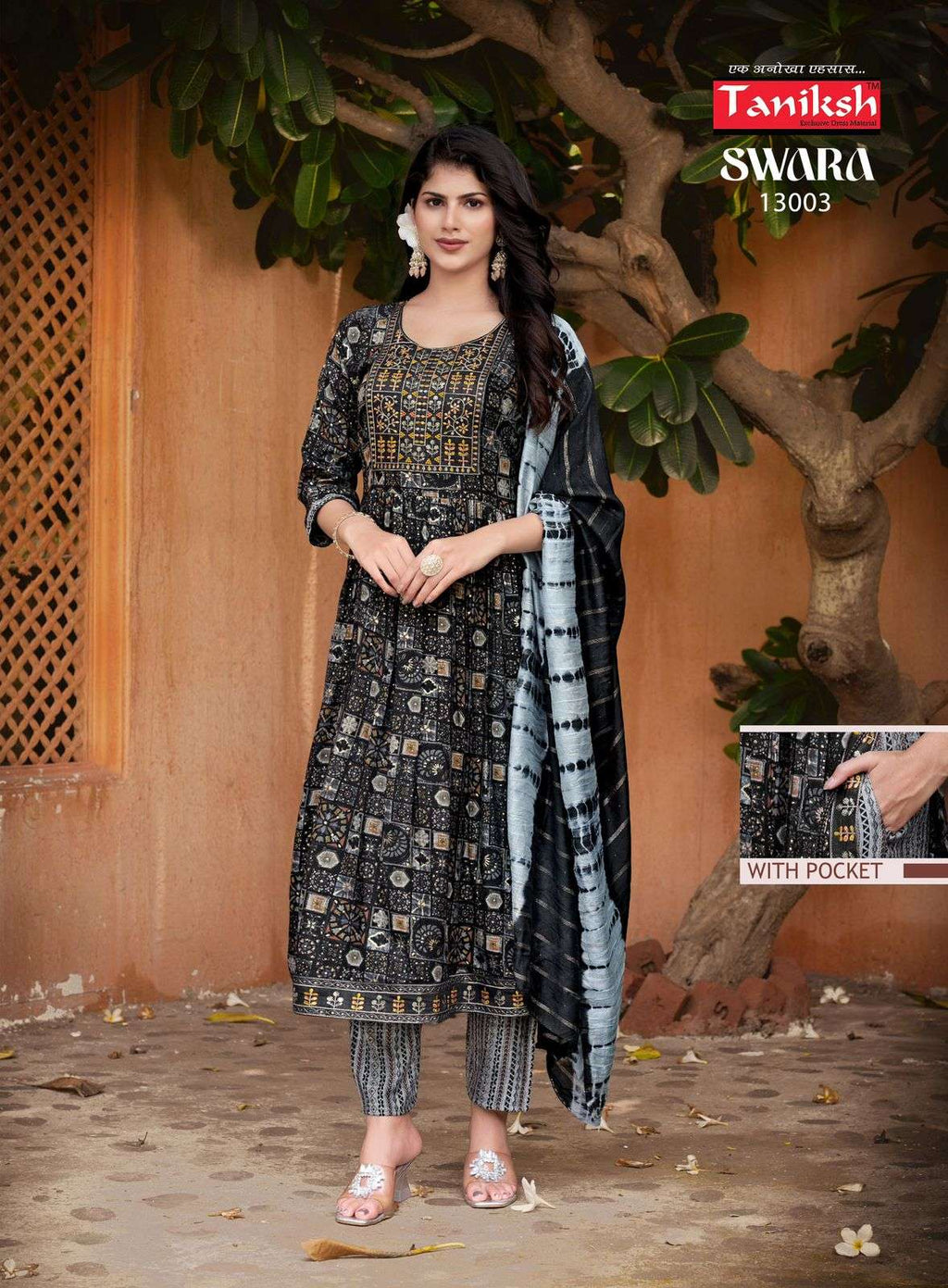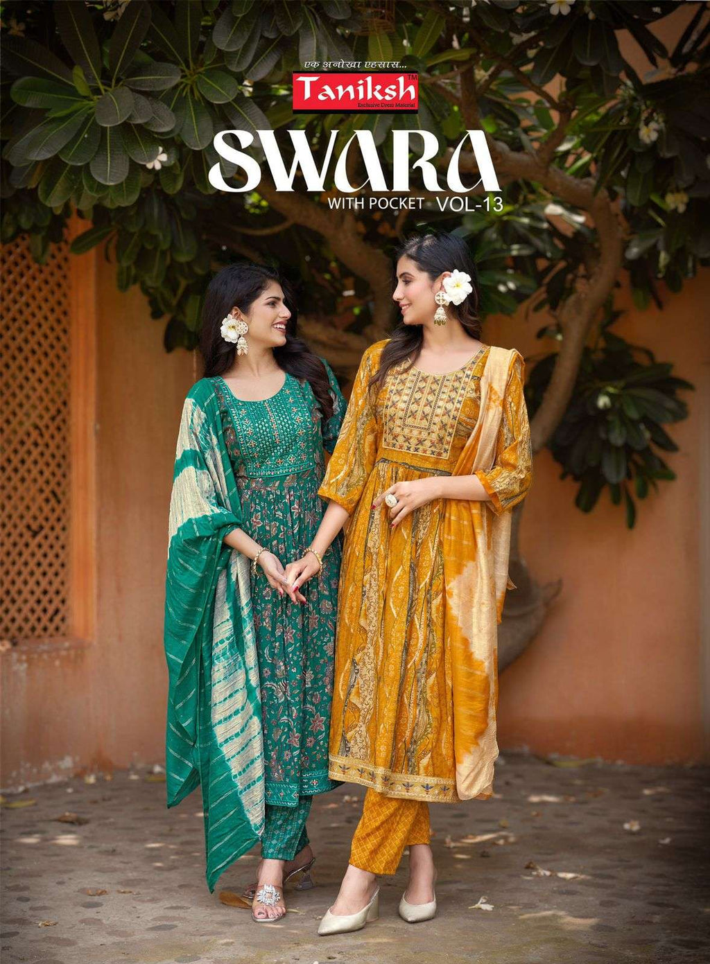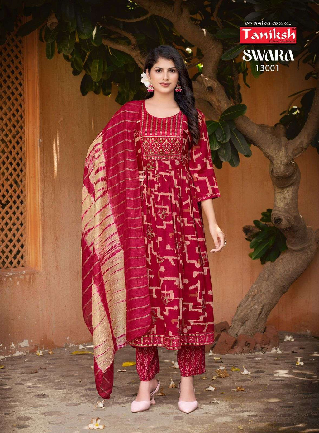 Taniksh Swara Vol 13 Rayon Print With Embroidery Work Naira Cut Kurti Combo Set