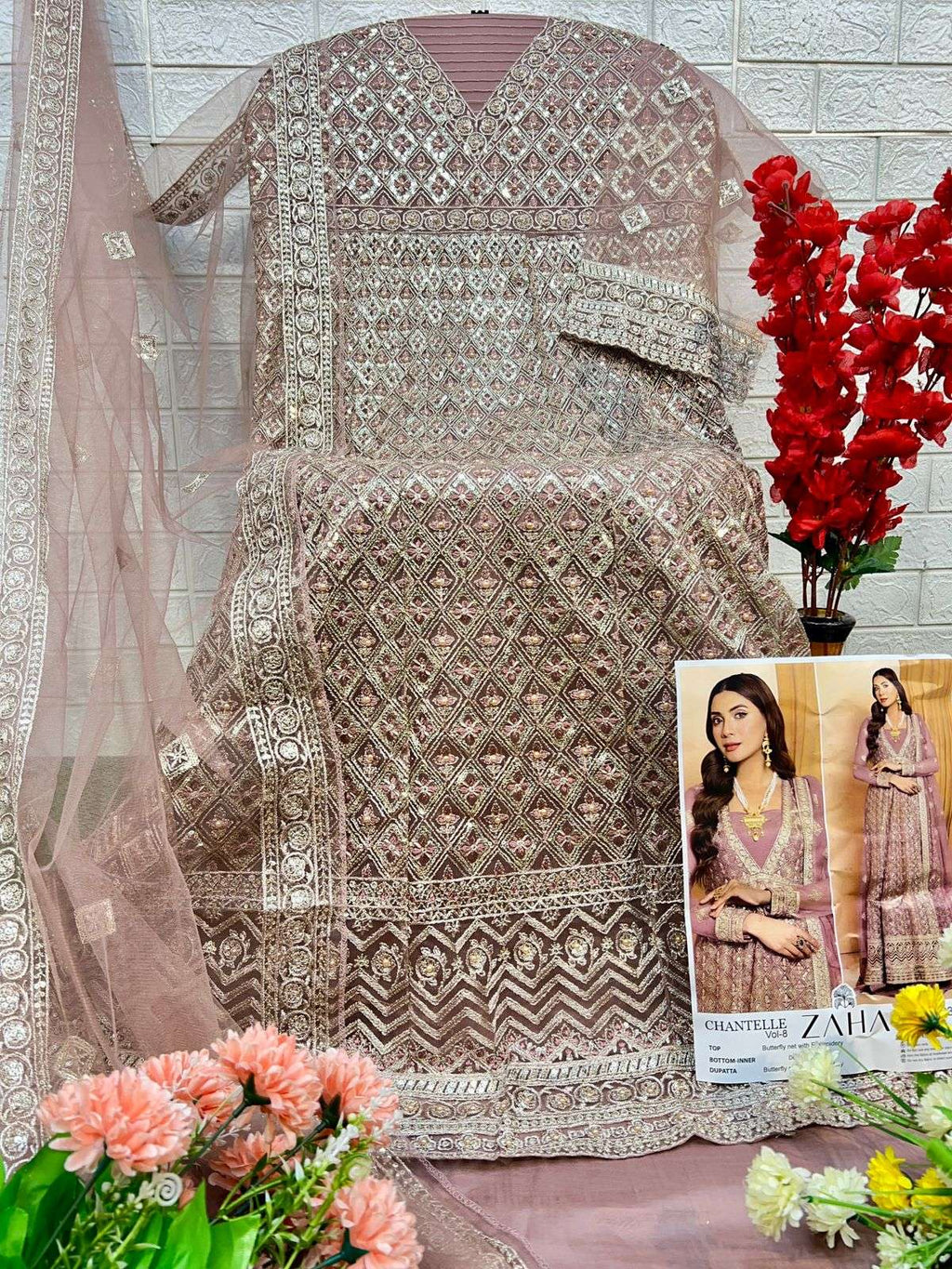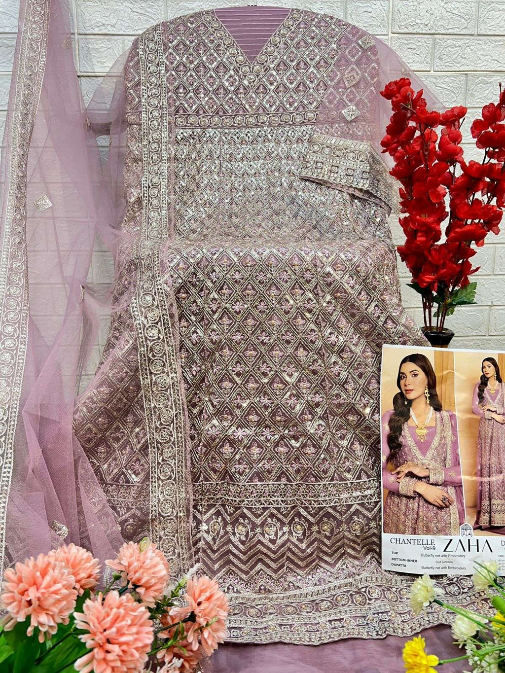 top : butterfly net with heavy embroidered with moti bottom :santoon dupatta : butterfly net heavy embroidered inner :- santoon |