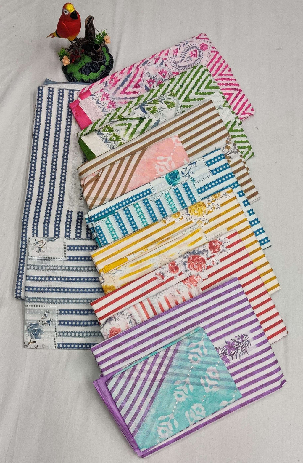 🔺Top: 100% Pure Cotton Exclusive Designer Print (2.50 mtrs apx) 🔺Dupatta: 100% Pure Cotton Mal Mal Print (2.30 mtrs apx) 🔺Bottom: 100% Pure Cotton Salwar (3 mtrs apx) |